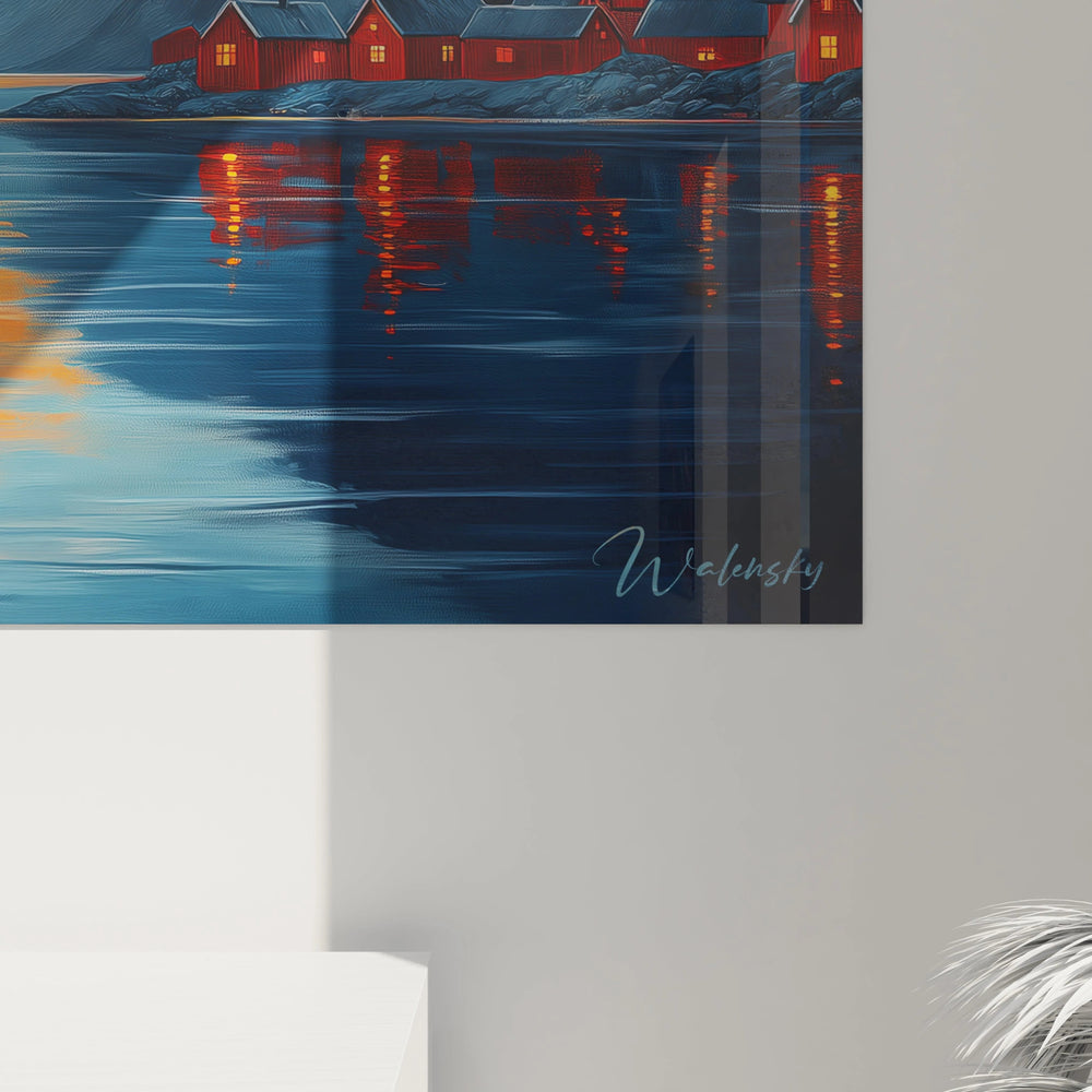 Ce tableau capte la tension délicate entre l’ombre des montagnes bleutées et la lumière dorée du soleil couchant. Les reflets vibrants sur l’eau calme, les touches chaleureuses de rouge des habitations, tout concourt à créer un univers lumineux et apaisant. En l’accrochant, vous invitez chez vous cette poésie nordique, cette sensation de calme intense que seul un paysage d’exception peut offrir.