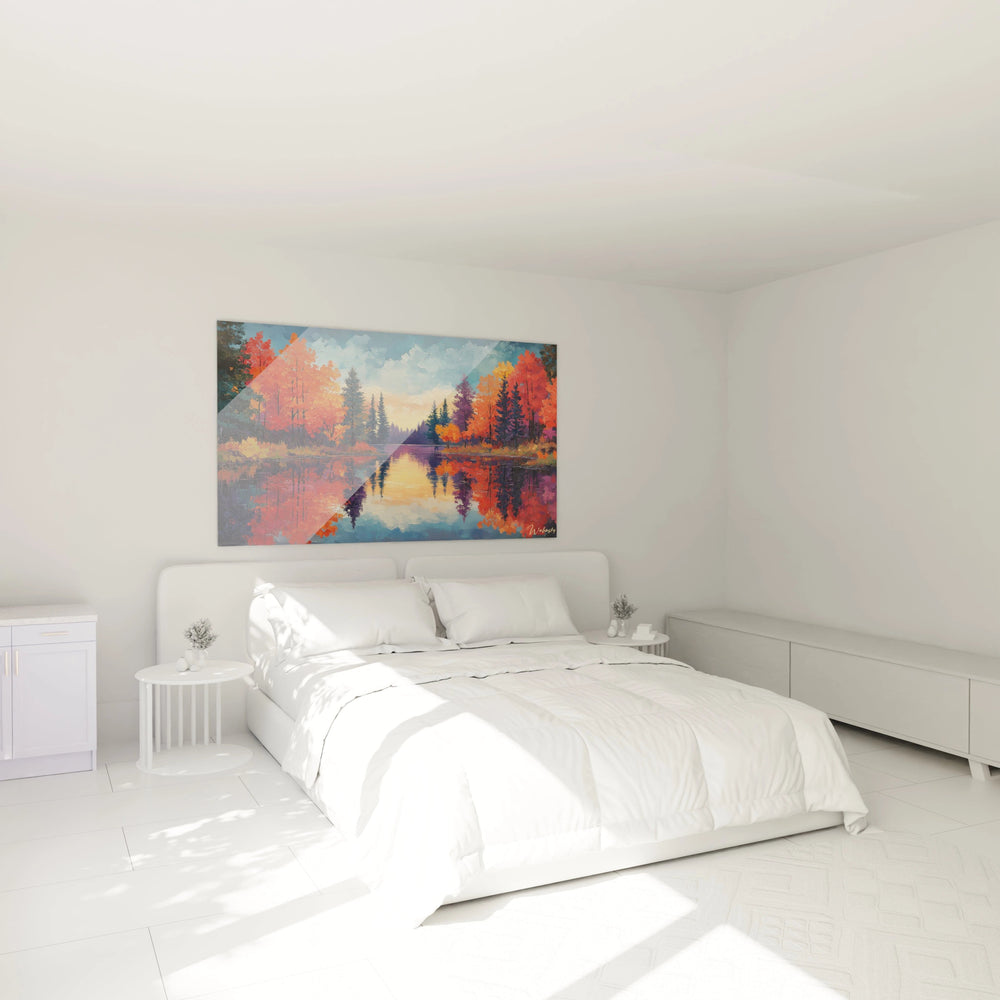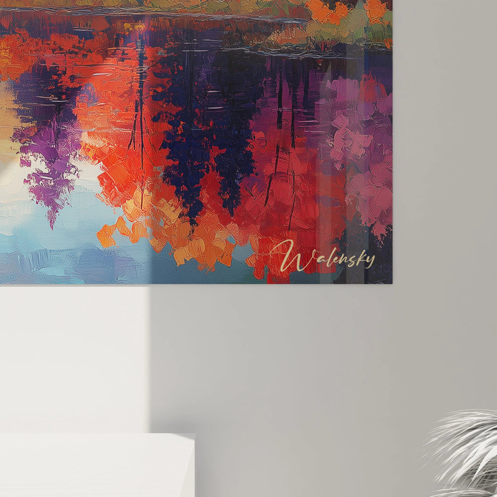 Ce tableau puise son inspiration d’une soirée paisible au bord d’un lac où les teintes rougeoyantes des arbres dansent à la surface de l’eau. La dynamique entre ciel et miroir aquatique crée une harmonie envoûtante, une symphonie visuelle où les rouge éclatant, orange brûlant et bleu profond s'entrelacent. En accrochant cette œuvre, vous recréez chez vous cette atmosphère intemporelle où chaque regard vous transporte au cœur d’une promenade contemplative, dans un monde où la nature révèle ses trésors les plus précieux.