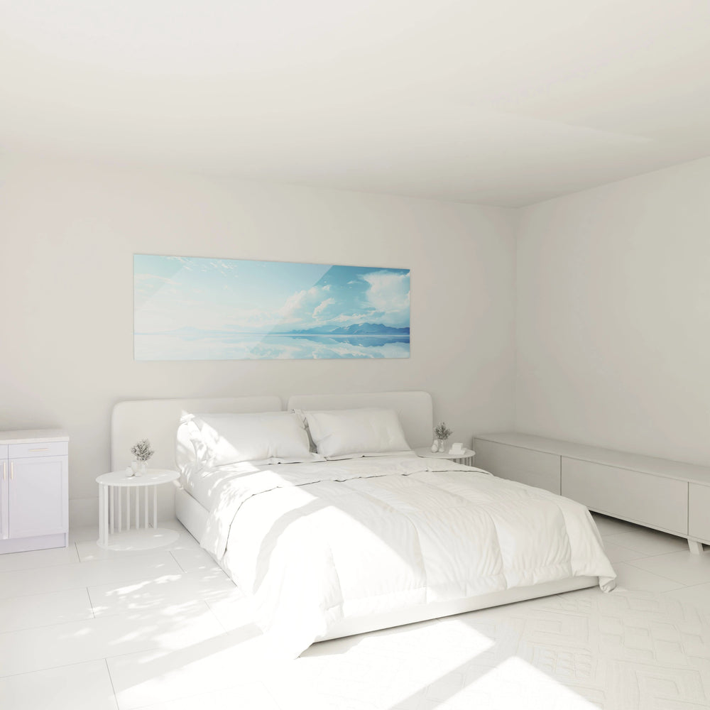 Ce tableau montagne captivant présente un paysage alpin éthéré où ciel et eau se rencontrent dans une harmonie parfaite. L'œuvre dépeint un lac aux eaux calmes qui reflète avec précision les montagnes bleutées et le ciel lumineux, créant un effet miroir saisissant. La composition panoramique offre une immersion totale dans cet environnement serein où les nuages délicats se fondent avec leurs reflets sur la surface lisse du lac. Les teintes bleues dominantes créent une atmosphère apaisante qui transporte immédiatement le spectateur dans un moment de contemplation pure.