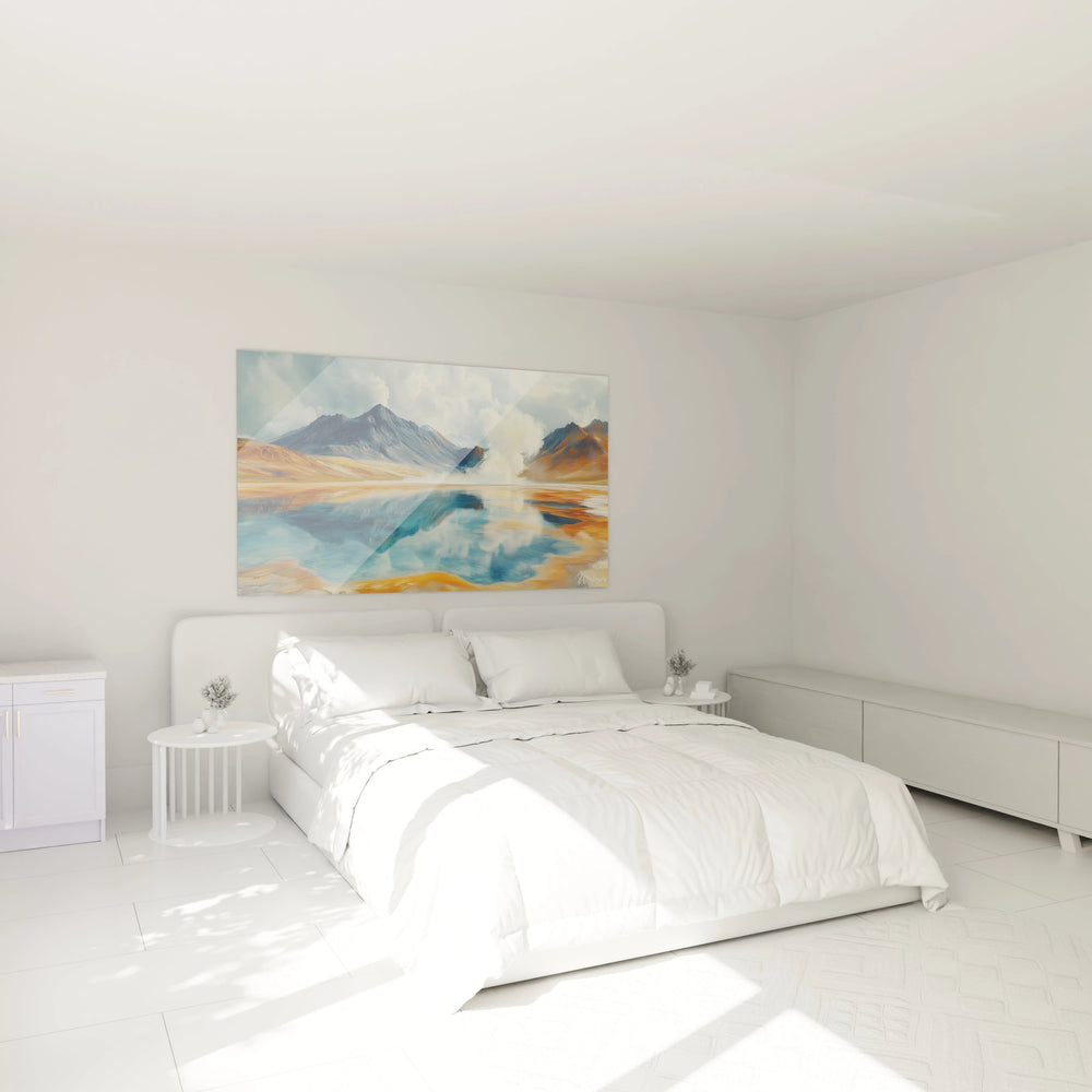 Ce tableau montagne géothermale présente une composition spectaculaire où un lac thermal turquoise se niche au cœur d'un paysage volcanique aux teintes ocres. Le tableau montagne avec vapeurs thermales révèle immédiatement un contraste saisissant entre les montagnes bleu-gris imposantes et les collines minérales aux couleurs chaudes. Cette décoration murale montagne capture l'essence même d'un écosystème volcanique actif où les vapeurs blanches s'élèvent des sources chaudes.