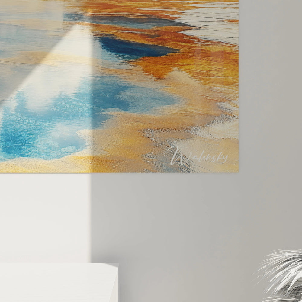 Née d’une exploration attentive des régions volcaniques, cette création reflète l’harmonie parfaite entre le bleu profond des eaux thermales et les teintes chaudes, ocres et orangées des terres minérales. La texture du tableau invite votre regard à caresser chaque relief, chaque nuance, pour ressentir la force primordiale et la sérénité qui se côtoient dans ce décor naturel.