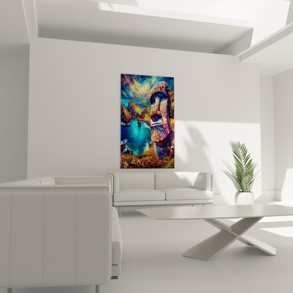 Ce tableau mural moaï présente une vision spectaculaire de l'Île de Pâques où l'une des célèbres statues monumentales domine majestueusement un paysage côtier aux couleurs extraordinaires. La statue moaï se dresse fièrement sur une falaise rocheuse, ses traits sculptés dans la pierre révélant l'expression solennelle et mystérieuse qui caractérise ces gardiens ancestraux des océans. L'artiste a magnifié cette œuvre d'art mural polynésien en appliquant une palette chromatique intense où les bleus turquoise de l'océan Pacifique contrastent avec les tons dorés et cuivrés de la roche volcanique. Le tableau décoratif île de pâques capture l'essence mystique de Rapa Nui à travers un rendu pictural qui transforme le réalisme en une vision onirique. Les formations rocheuses environnantes, sculptées par des millénaires d'érosion marine, créent un amphithéâtre naturel où résonnent les échos d'une civilisation disparue. Ce tableau mural archipel polynésien révèle la puissance tellurique de ce territoire isolé au cœur du Pacifique, où chaque pierre semble porter la mémoire des Rapanui. L'œuvre transcende la simple représentation géographique pour devenir une méditation visuelle sur le temps, l'espace et la permanence de l'art dans la nature.