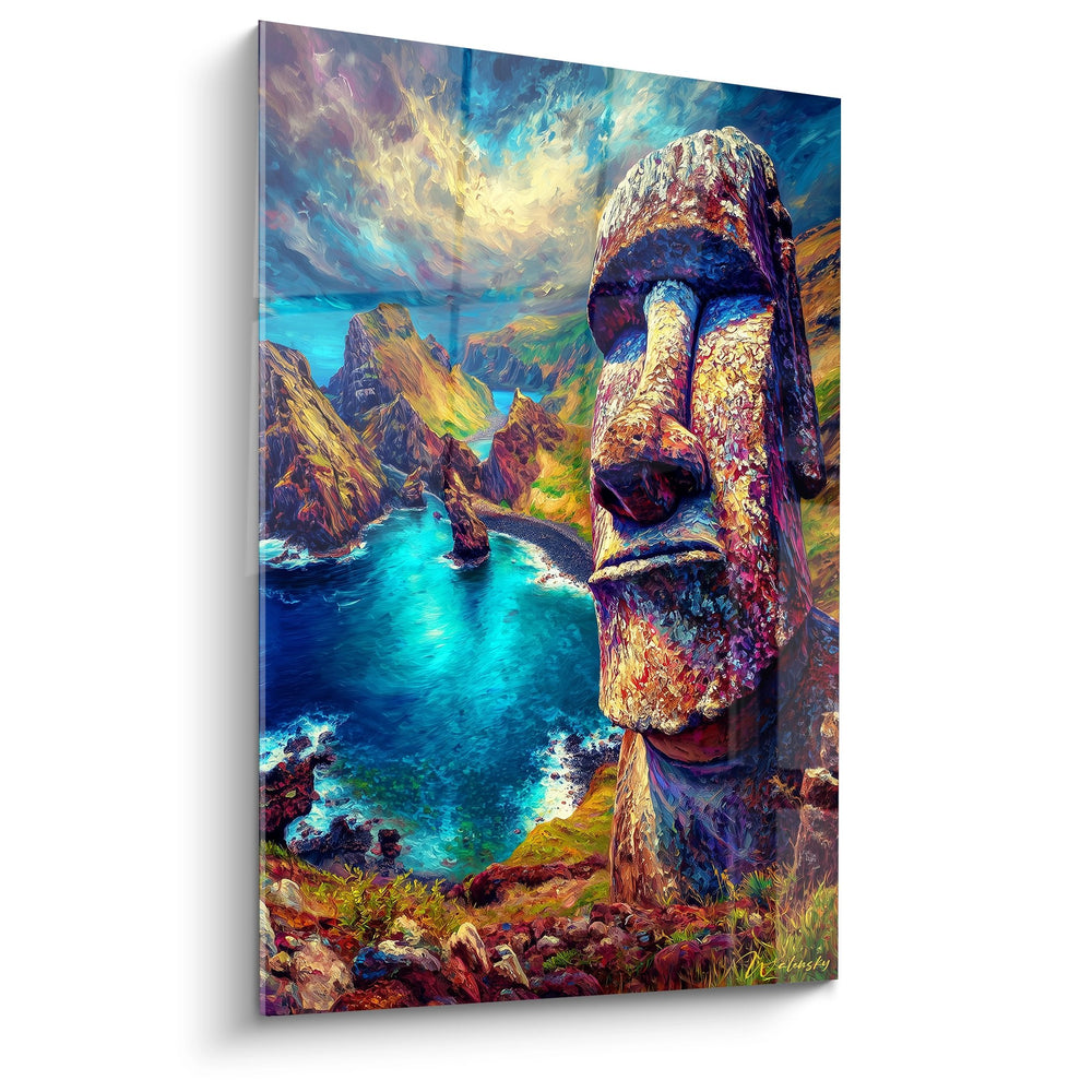 La symbolique des moaïs trouve dans cette œuvre une expression contemporaine saisissante. Les bleus océaniques symbolisent l'infini et l'éternité, tandis que les tons terreux évoquent l'ancrage ancestral et la sagesse millénaire. Cette décoration murale mystique joue sur les contrastes chromatiques pour créer une tension visuelle captivante, où le ciel tourmenté répond aux remous de l'océan dans une symphonie coloriste remarquable.