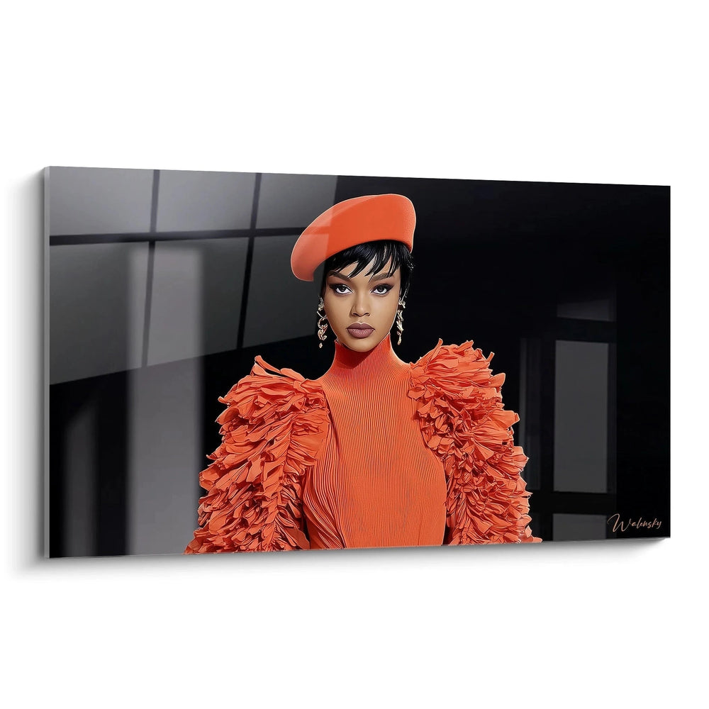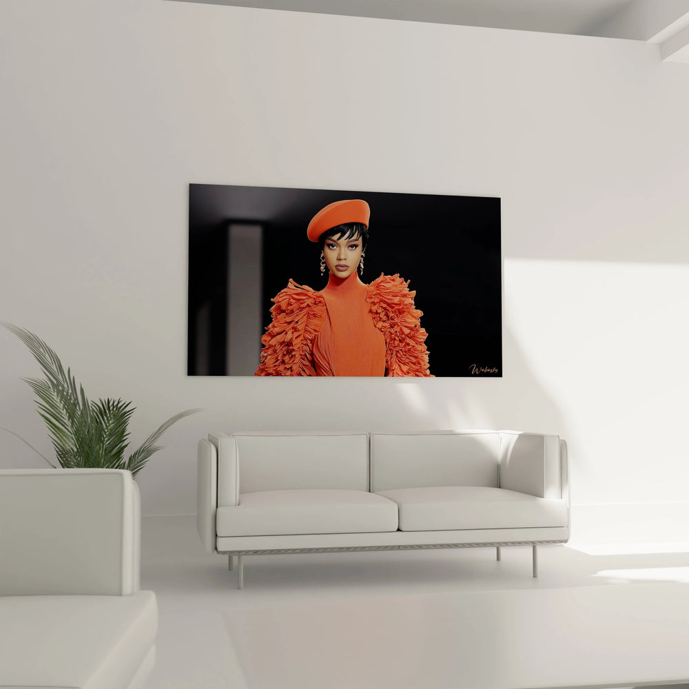 Ce tableau mural haute couture exceptionnel capture l'essence de la beauté féminine contemporaine à travers un portrait saisissant d'une femme d'origine africaine incarnant l'élégance de la haute couture. L'œuvre présente un personnage féminin au regard intense et magnétique, coiffé d'un béret orange corail qui encadre parfaitement son visage aux traits délicats. Ses cheveux noirs courts et son teint aux reflets dorés créent un contraste sublime avec la palette chromatique dominante.