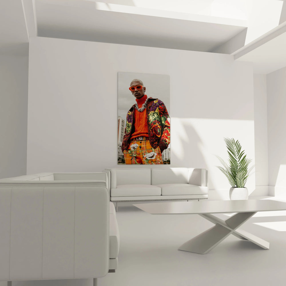 Ce tableau mural streetwear capture l'essence de la mode urbaine contemporaine à travers un portrait saisissant qui transcende les codes vestimentaires traditionnels. L'œuvre présente un modèle arborant un style layering sophistiqué, véritable manifeste de la créativité street fashion. Le pull orange vif à col roulé torsadé forme la base de cette composition vestimentaire audacieuse, créant un contraste vibrant avec le cardigan oversized aux motifs floraux psychédéliques. Les tons violets, verts, rouges et jaunes du cardigan évoquent l'esthétique des années 60-70 réinterprétée dans un contexte urbain moderne. Le pantalon à carreaux orange orné d'imprimés floraux blancs complète cette harmonie chromatique explosive, démontrant l'art du mix-and-match caractéristique de la culture streetwear. Les accessoires - lunettes de soleil orange rondes, boucles d'oreilles argentées et collier chaîne imposant - renforcent l'identité fashion forward du personnage. La coupe blonde platine courte apporte une dimension futuriste à l'ensemble, tandis que l'arrière-plan urbain flou ancre l'œuvre dans son contexte citadin. Cette représentation artistique streetwear célèbre l'individualité et l'expression personnelle à travers la mode, incarnant parfaitement l'esprit libre et créatif de la génération streetwear actuelle.