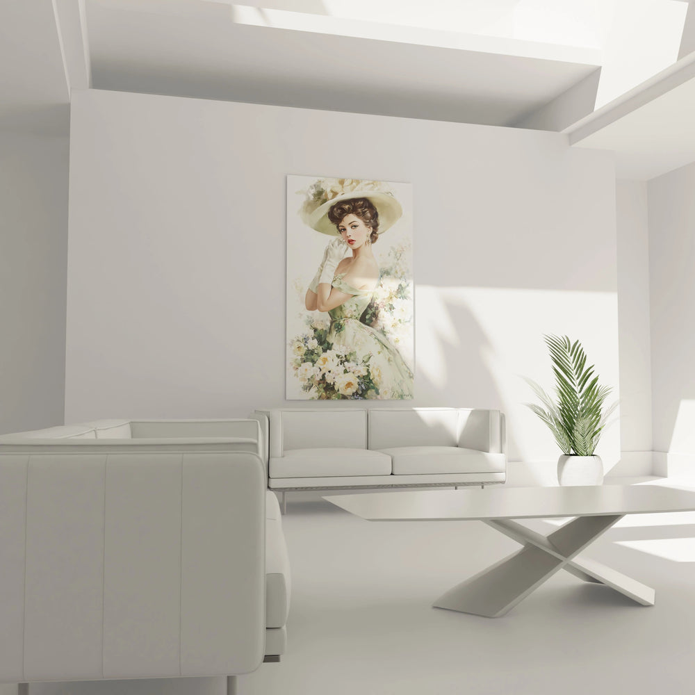 Les couleurs choisies pour ce tableau décoratif mode vintage ne sont pas le fruit du hasard. Le vert tendre symbolique de la robe symbolise l'espoir, la jeunesse et la renaissance, while le blanc immaculé des fleurs et des accessoires évoque la pureté et l'innocence. Cette palette chromatique délicate crée une harmonie visuelle apaisante, idéale pour une ambiance intérieure raffinée. Les tons chair rosés du visage apportent chaleur humaine et vie à l'ensemble, tandis que les touches dorées des bijoux ajoutent une note de luxe et de préciosité.