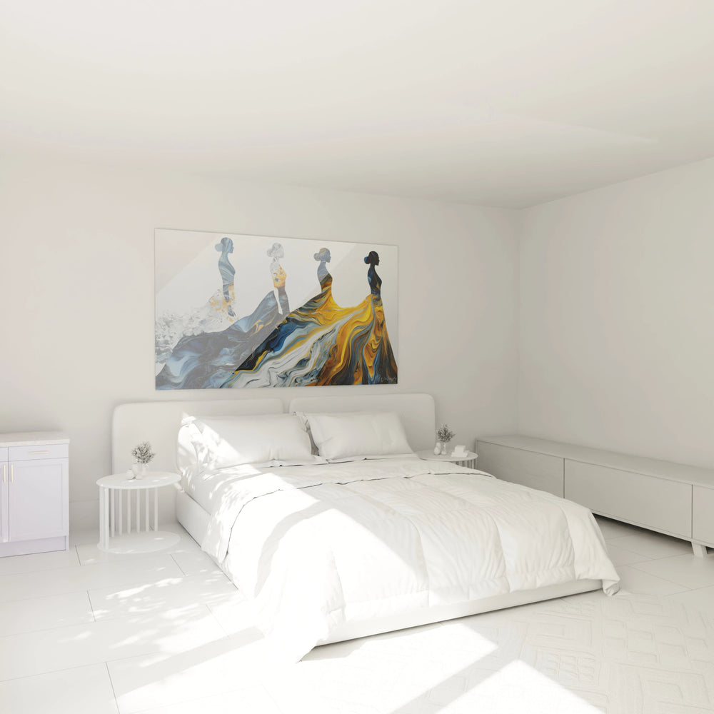Ce tableau mural haute couture d'exception capture l'essence de la féminité artistique à travers quatre silhouettes féminines gracieuses aux allures de déesses contemporaines. Chaque figure féminine se dresse avec une prestance naturelle, vêtue de robes fluides aux textures marbrées qui évoquent les plus beaux tissus de soie liquide. Les motifs ondulants semblent danser sur leurs corps, créant un effet visuel hypnotique où mode et art fusionnent harmonieusement. Les tons bleus profonds dominent la composition, rappelant les mystères de l'océan, tandis que les accents dorés apportent une touche de luxe et de raffinement. Les nuances de blanc et de gris complètent cette palette sophistiquée, créant des jeux de lumière subtils qui magnifient chaque courbe. L'arrière-plan neutre permet aux silhouettes de se détacher avec élégance contemporaine, concentrant l'attention sur la beauté des formes et des textures. Les robes marbrées semblent se transformer en vagues au premier plan, suggérant un mouvement perpétuel qui transcende la statisme de l'art traditionnel. Cette œuvre murale moderne transforme instantanément l'espace en galerie d'art contemporain, apportant une dimension esthétique exceptionnelle à votre intérieur avec ce tableau décoratif féminin.
