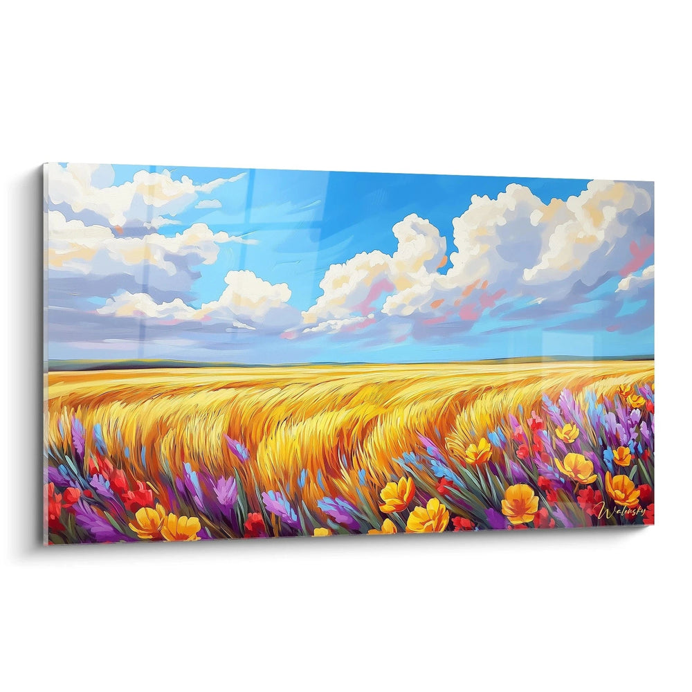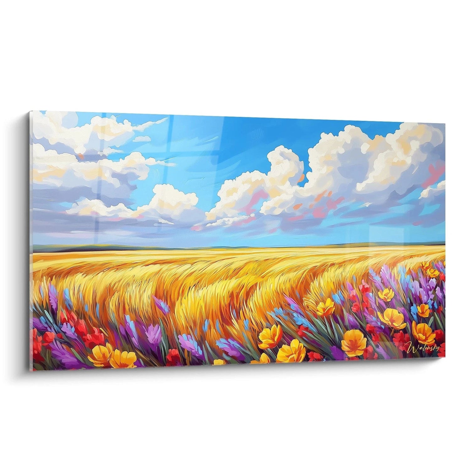 Ce tableau campagne est né d'une expérience profondément sensorielle que j'ai vécue lors d'une excursion estivale dans les plaines céréalières. La rencontre fortuite entre la majesté des champs dorés ondulant sous la brise et l'explosion colorée des fleurs sauvages qui bordaient ces étendues m'a littéralement coupé le souffle. Je me souviens avoir été frappé par ce contraste saisissant : l'immensité ordonnée des épis de blé face à la rébellion joyeuse et spontanée des coquelicots, bleuets et autres fleurs champêtres.