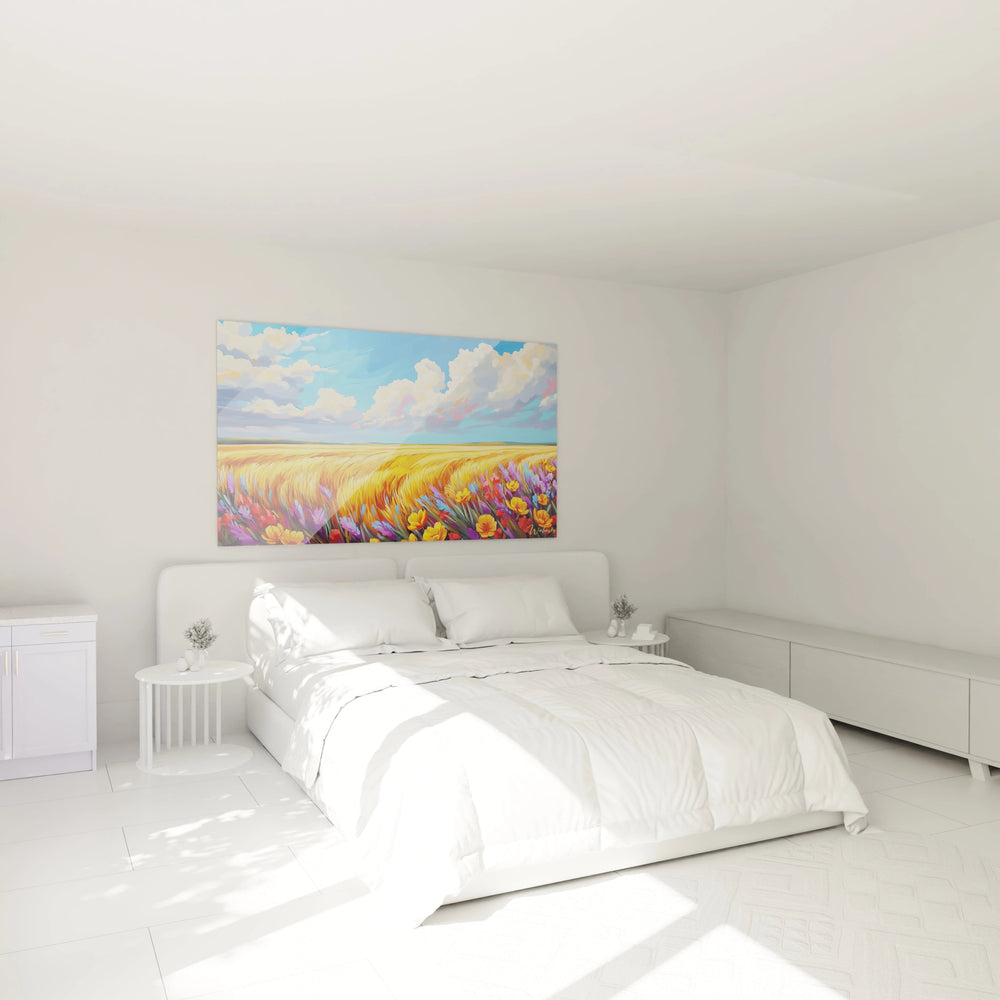 Ce tableau campagne évoque instantanément un sentiment de plénitude et de sérénité, transportant l'observateur dans un espace où le temps semble suspendu. La vastitude du paysage invite à la contemplation et au lâcher-prise, offrant une échappatoire bienvenue au tumulte quotidien. Les contrastes chromatiques entre le ciel azuré, les champs dorés et les touches florales multicolores stimulent les sens et éveillent une joie primitive, celle que l'on ressent face à la beauté brute et authentique de la nature.