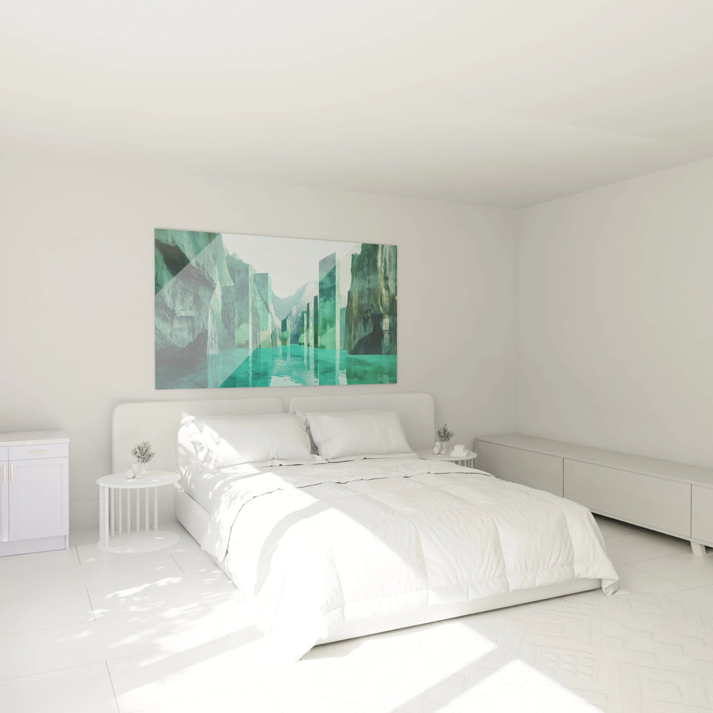 La composition de ce tableau canyon émeraude repose sur une structure dynamique où les éléments verticaux dominent le centre de l'image. Les monolithes translucides sont stratégiquement positionnés pour créer un chemin visuel qui guide le regard du spectateur vers la profondeur du canyon. Les falaises naturelles encadrent la scène sur les côtés, créant un effet de couloir qui amplifie la sensation de profondeur.