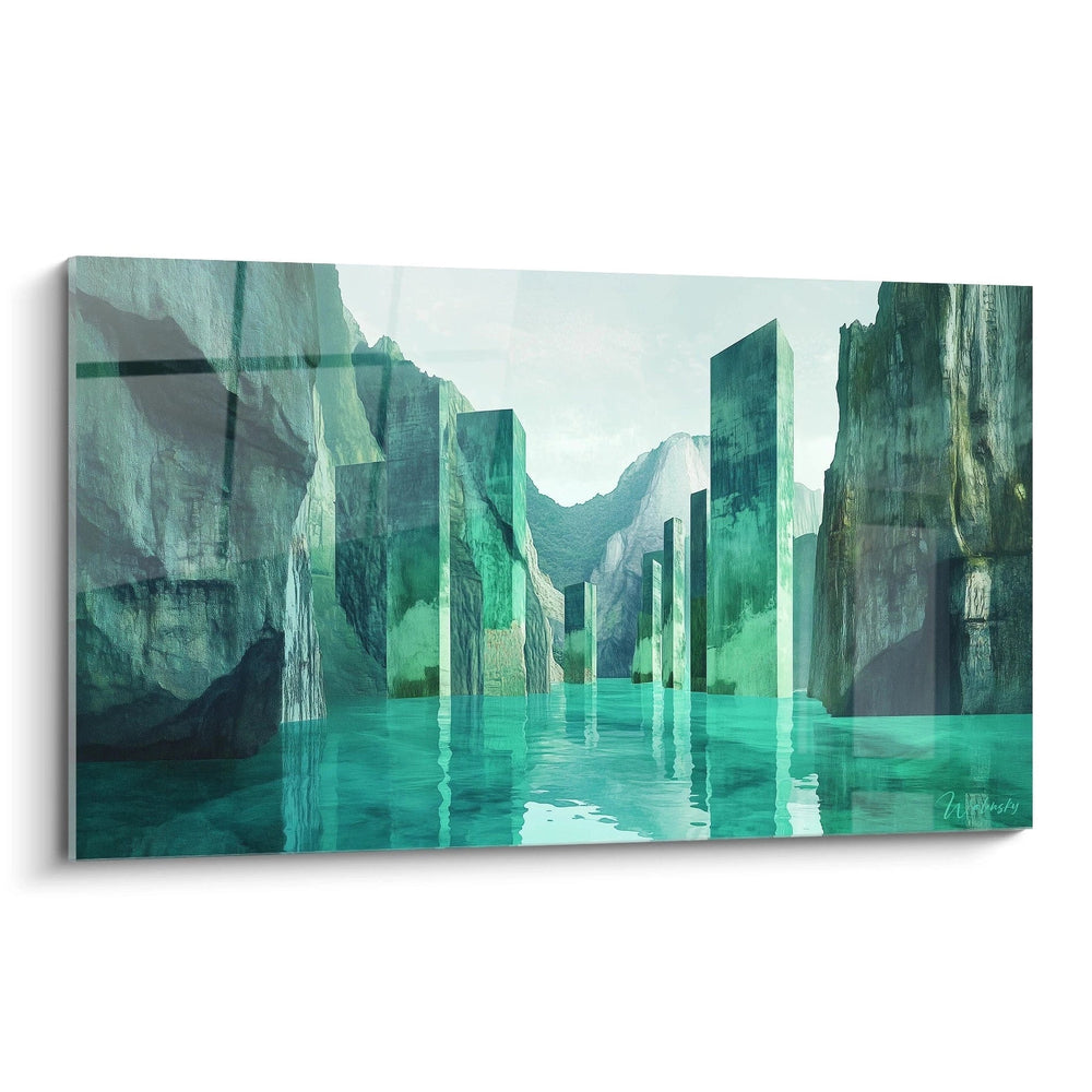 Découvrez ce tableau paysage aquatique captivant qui représente un environnement surréaliste où des monolithes émeraude s'élèvent majestueusement d'une eau turquoise cristalline. La composition équilibre parfaitement les éléments verticaux avec les reflets horizontaux sur l'eau calme. Ce qui distingue immédiatement cette œuvre est le contraste saisissant entre les structures géométriques précises et les formations rocheuses naturelles plus organiques, créant une tension visuelle fascinante entre ordre et chaos.