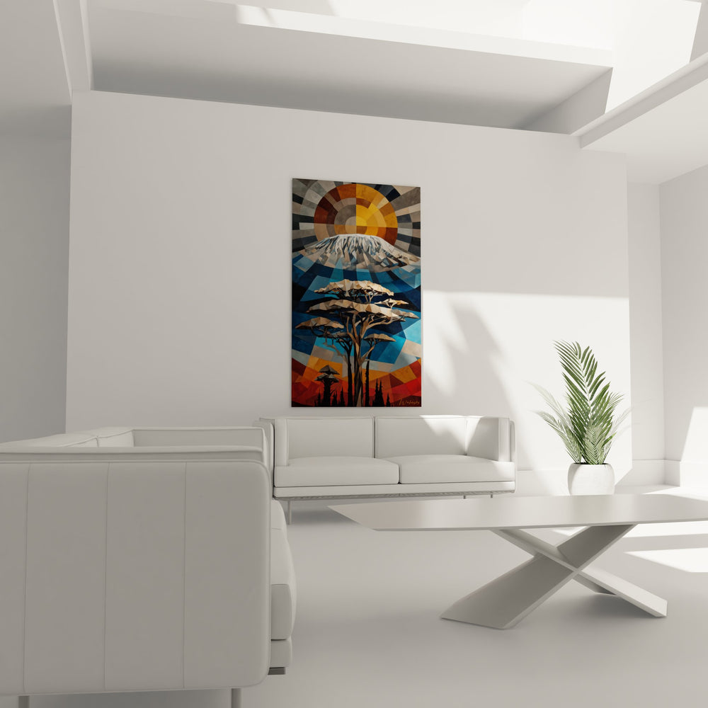 Tags : tableau kilimandjaro, art géométrique africain, montagne décorative, baobab stylisé, paysage polygonal
