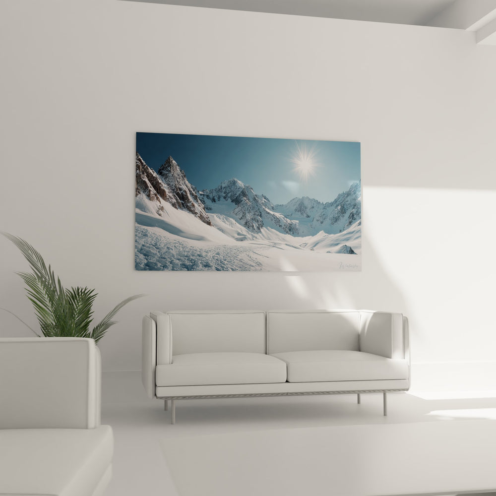 Ce tableau mural montagne enneigée présente un paysage alpin d'une beauté saisissante, où des sommets enneigés se dressent majestueusement sous un soleil éclatant. L'œuvre capture avec précision l'immensité d'un glacier alpin s'étendant entre des pics rocheux aux parois abruptes. La composition révèle un paysage hivernal montagnard d'exception, où la neige immaculée recouvre chaque relief, créant un contraste saisissant avec les roches sombres qui percent çà et là. Ce tableau hiver montagne illustre parfaitement la grandeur de la nature alpine, avec ses formations glaciaires qui serpentent entre les sommets. L'artiste a su capter cette lumière hivernale éclatante qui illumine la scène, créant des jeux d'ombres et de reflets sur la surface neigeuse. Les détails minutieux de cette décoration murale paysage alpin permettent d'apprécier la texture de la neige, les crevasses du glacier et l'architecture naturelle des montagnes. Cette représentation fidèle d'un environnement montagnard hivernal apporte une dimension contemplative et apaisante à tout espace de vie, invitant à l'évasion vers ces territoires préservés de haute altitude.
