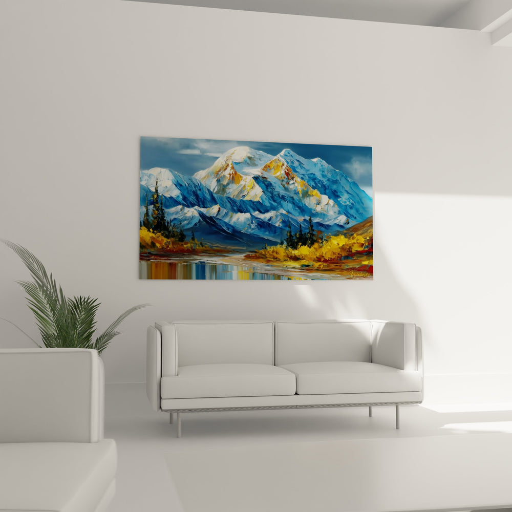 Tags : tableau montagne enneigée, peinture sommets alpins, décoration murale nature, art paysage montagnard, tableau reflets lac