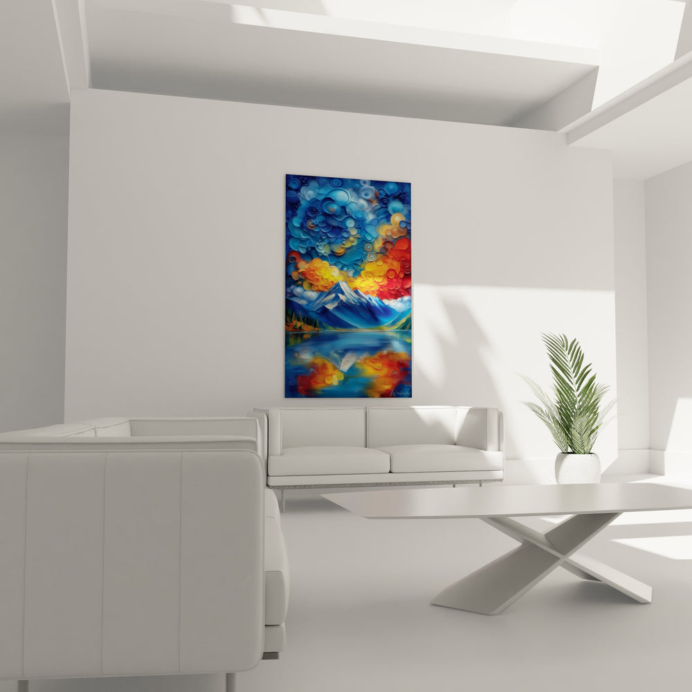 Imaginez-vous dans votre salon, accueillant vos invités avec une œuvre qui embrasse l'ampleur majestueuse des montagnes, alliée à un ciel embrasé de couleurs vives. Chaque coup d'œil à ce cadre abstrait ne fait pas que décorer : il invite à la contemplation et à l'émotion. Les reflets cosmiques capturés dans cette scène créent un dialogue entre nature et imagination, permettant à vos murs de raconter une histoire inoubliable.