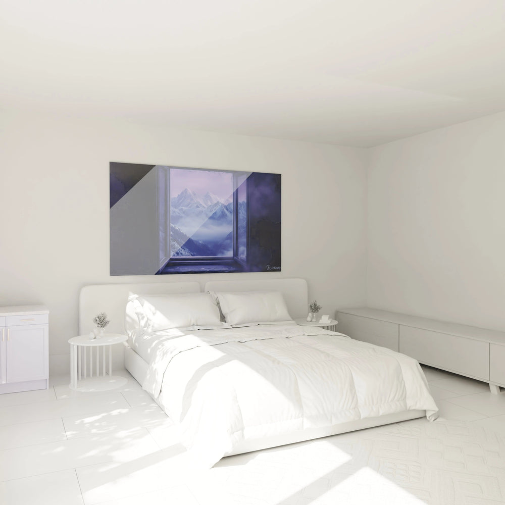 Ce tableau montagne présente une vue saisissante à travers une fenêtre ouverte sur un paysage alpin majestueux. L'œuvre capture l'essence d'un panorama montagnard baigné dans une atmosphère violette et bleue envoûtante. Le tableau montagne fenêtre crée un effet de profondeur remarquable grâce à la perspective de la fenêtre qui encadre parfaitement les sommets enneigés. Cette décoration murale montagne offre une évasion visuelle immédiate vers des hauteurs glacées et mystérieuses. Les tons violets dominants confèrent à cette œuvre une dimension onirique unique, transformant un simple paysage en invitation au voyage contemplatif.
