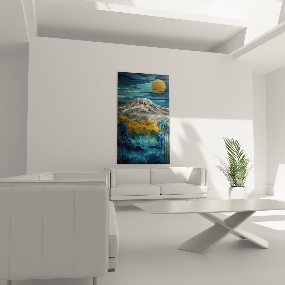 Ce tableau mural montagne présente une interprétation moderne et géométrique d'un paysage montagneux tropical. L'œuvre se compose de multiples facettes pixelisées qui créent une mosaïque colorée rappelant l'art digital contemporain. Au centre de la composition, un mont enneigé se dresse majestueusement, ses sommets blancs contrastant avec le ciel bleu géométrique parsemé de nuages stylisés. Le soleil doré occupe une position stratégique dans le ciel, apportant une lumière chaleureuse à l'ensemble de la scène. Les palmiers tropicaux encadrent la composition de manière élégante, leurs silhouettes bleues créant un premier plan dynamique. Cette décoration murale montagne transforme un paysage traditionnel en une œuvre d'art moderne grâce à sa technique de fragmentation géométrique. Les différents plans de couleur, du bleu océanique au premier plan jusqu'aux tons dorés des collines intermédiaires, créent une profondeur visuelle remarquable. Ce tableau décoratif montagne moderne s'inspire des techniques de l'art numérique pour offrir une vision contemporaine des paysages de montagne exotiques.
