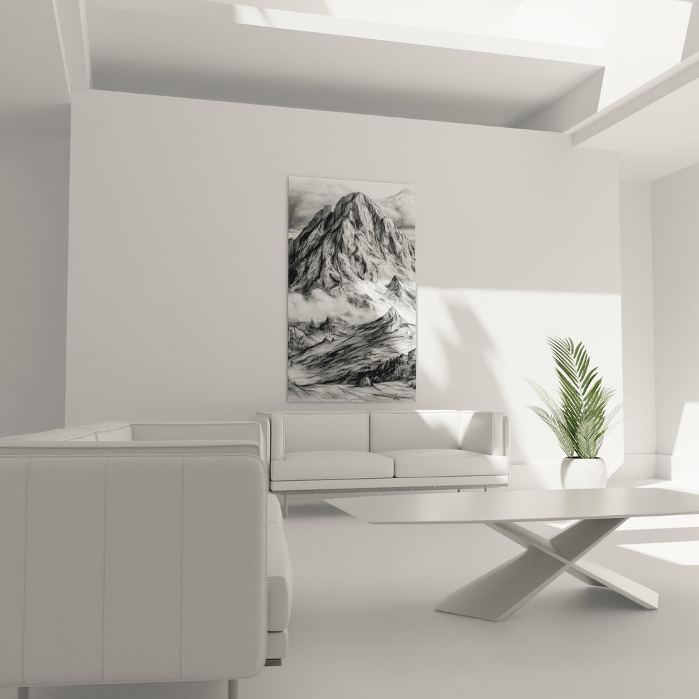 Ce tableau montagne volcanique présente une composition saisissante où se dresse un pic volcanique imposant aux flancs escarpés, capturé dans un style artistique raffiné en noir et blanc. L'œuvre révèle la puissance tellurique de cette formation géologique volcanique à travers un jeu subtil d'ombres et de lumières qui sculpte chaque détail de la roche. Au premier plan, des collines ondulantes créent une perspective naturelle vers cette montagne volcanique spectaculaire qui domine l'horizon de sa présence minérale. Les nuages tourbillonnants dans le ciel renforcent l'atmosphère dramatique de cette représentation artistique de volcan. Ce tableau mural montagne capture l'essence même de la géologie volcanique avec une précision remarquable, où chaque trait de crayon révèle la texture rugueuse de la lave solidifiée et des coulées anciennes. L'artiste a su traduire la magnificence de cette œuvre d'art volcanique en explorant les contrastes entre les zones d'ombre profondes des crevasses et la luminosité des crêtes exposées. Cette décoration murale volcan témoigne de la force créatrice et destructrice de la nature, immortalisant un paysage où le temps géologique se lit dans chaque strate rocheuse, créant une pièce décorative exceptionnelle pour les amateurs d'art géologique.