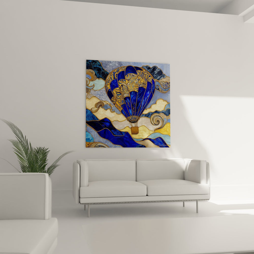 Cette œuvre d'art exceptionnelle présente un tableau mural montgolfière dans un style Art Nouveau raffiné, où dominent les teintes profondes de bleu cobalt et les ornementations dorées sophistiquées. La montgolfière décorative occupe majestueusement le centre de la composition, ornée de motifs floraux et géométriques complexes qui rappellent les créations de l'École de Nancy. Les panneaux de l'aérostat révèlent des motifs art nouveau montgolfière finement ciselés, alternant entre sections bleues profondes et détails dorés éclatants. L'arrière-plan présente un paysage stylisé montgolfière composé de nuages voluptueux aux formes organiques, traversés par des volutes dorées qui évoquent les vents porteurs. Cette décoration murale montgolfière transcende la simple représentation pour devenir une véritable célébration de l'art décoratif français du début du XXe siècle. Les techniques de vitrail semblent avoir inspiré l'artiste, créant des jeux de transparence et d'opacité qui donnent vie à cette œuvre d'art montgolfière exceptionnelle. Chaque élément de la composition participe à créer une harmonie parfaite entre tradition artistique et innovation décorative, faisant de ce tableau collection montgolfière une pièce maîtresse pour tout amateur d'art raffiné.