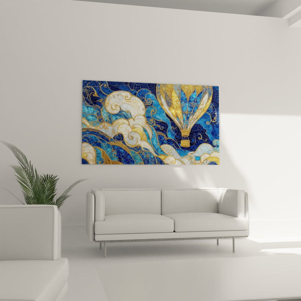 La palette chromatique de ce tableau voyage céleste puise dans les tons nobles du bleu roi et de l'or, symbolisant l'élévation spirituelle et la noblesse de l'aventure aérienne. Ces couleurs évoquent la liberté et l'aspiration vers les cieux, tandis que les nuances dorées représentent la préciosité du voyage et l'accomplissement des rêves. Les blancs nacrés des nuages apportent douceur et sérénité à cette composition dynamique.