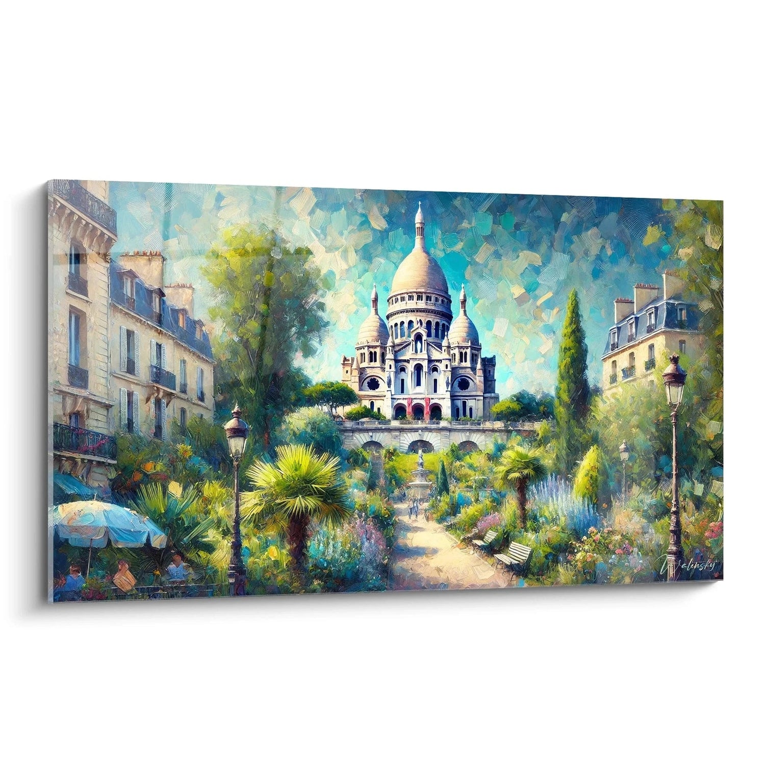 Imaginez un instant suspendu, où la lumière douce du soleil effleure délicatement les feuillages des jardins de Montmartre, tandis que la silhouette majestueuse de la basilique se dresse en arrière-plan. Ce tableau, véritable hommage à ce lieu mythique, est bien plus qu’une simple décoration : il incarne l’âme vibrante et poétique de Paris, pour transformer votre intérieur en une scène d’exception.