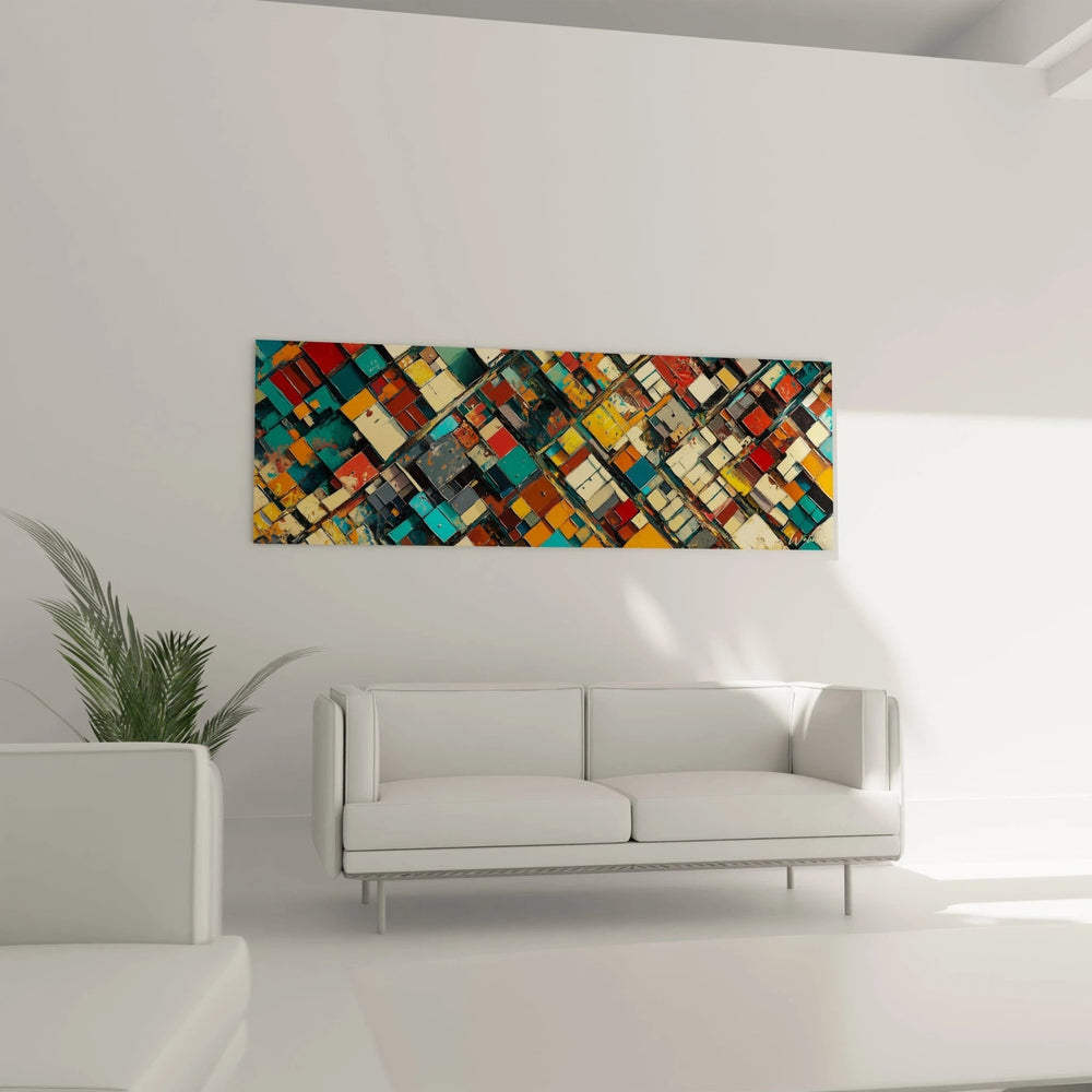 Ce tableau géométrique abstrait révèle une composition exceptionnelle de formes fragmentées disposées en diagonale dynamique. L'œuvre présente une mosaïque complexe de rectangles et carrés aux dimensions variées, créant un effet de profondeur saisissant. Chaque élément géométrique semble flotter dans un espace tridimensionnel, générant une sensation de mouvement perpétuel. Cette décoration murale géométrique contemporaine capture immédiatement l'attention par son organisation sophistiquée et sa richesse chromatique. Les formes angulaires se chevauchent et s'entremêlent, créant des jeux d'ombre et de lumière qui donnent vie à l'ensemble de la composition.