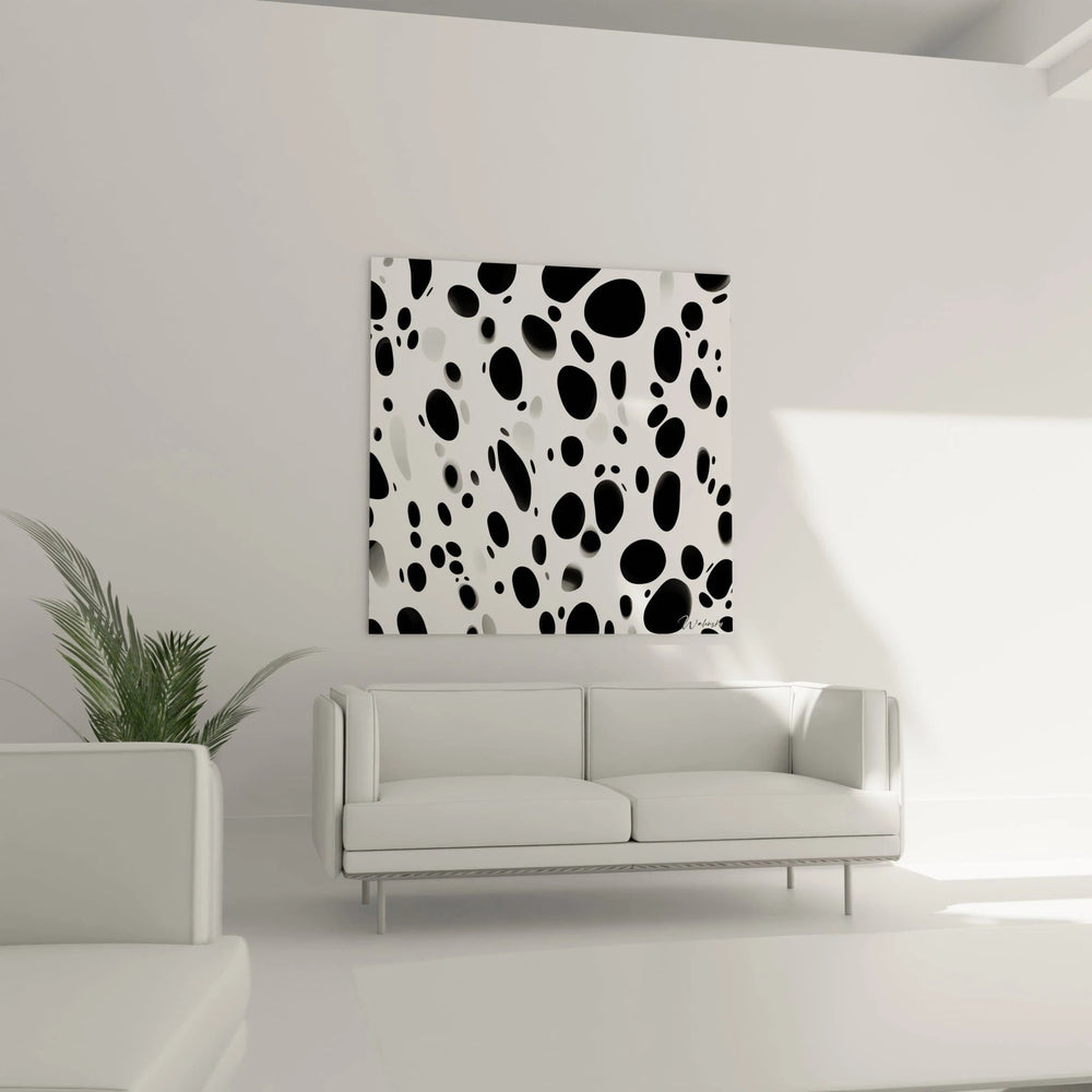 Ce tableau tacheté noir et blanc capture immédiatement l'attention par sa composition dynamique et équilibrée. Des formes organiques en noir profond et gris nuancé se déploient harmonieusement sur un fond blanc immaculé, créant une danse visuelle captivante. Chaque tache semble flotter dans l'espace, générant une impression de mouvement perpétuel et de légèreté. La distribution des éléments tachetés révèle une intentionnalité artistique subtile qui transforme ce tableau noir et blanc en une expérience visuelle méditative. La première impression est celle d'un équilibre parfait entre spontanéité et contrôle, où chaque élément trouve naturellement sa place dans cette composition monochrome saisissante.