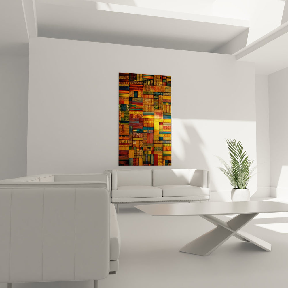 Ce tableau mural art tribal présente une composition exceptionnelle de motifs géométriques africains organisés en mosaïque harmonieuse. L'œuvre rassemble une multitude de patterns traditionnels issus de différentes cultures africaines, créant un véritable patchwork tribal décoratif. Chaque section révèle des techniques artisanales authentiques : tissages kente aux rayures colorées, motifs bogolan aux tons ocres, patterns ndébélé aux formes géométriques précises, et textiles mudcloth aux dessins ancestraux. La décoration murale africaine s'exprime ici à travers une palette riche dominée par les oranges chaleureux, les bleus profonds, les verts émeraude et les rouges terre. Cette composition artistique tribale évoque l'artisanat textile traditionnel africain, où chaque motif raconte une histoire, symbolise une identité culturelle ou représente des croyances spirituelles. L'agencement en damier irrégulier crée un rythme visuel captivant, transformant ce tableau ethnique contemporain en une fenêtre ouverte sur la richesse culturelle du continent africain. Les variations de textures et de motifs offrent une profondeur artistique remarquable, faisant de cette œuvre un art mural ethnique moderne parfait pour sublimer tout intérieur contemporain.