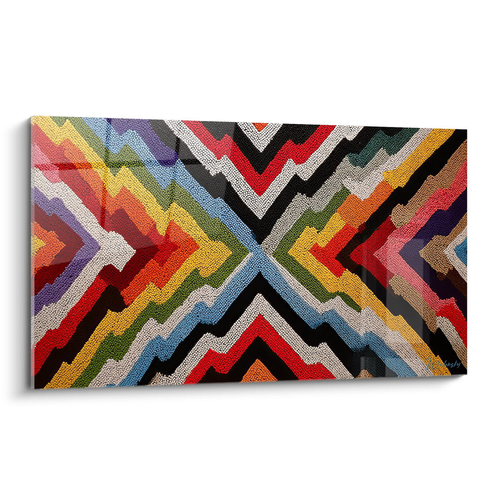 Ce magnifique tableau mural art tribal africain présente une composition saisissante de motifs géométriques multicolores disposés en chevrons dynamiques. L'œuvre révèle un travail minutieux de tissage ou de broderie, caractéristique de l'artisanat tribal africain traditionnel. Les lignes brisées et les formes angulaires créent un effet de mouvement perpétuel, évoquant l'énergie vitale des danses rituelles africaines. Cette décoration murale ethnique sophistiquée témoigne de la richesse des traditions textiles africaines, où chaque motif porte une signification symbolique profonde. Le tableau tribal géométrique révèle une maîtrise technique exceptionnelle dans l'agencement des couleurs et des formes, créant une harmonie visuelle parfaite malgré la complexité du design. Cette œuvre d'art africain contemporain réinterprète les codes esthétiques ancestraux tout en s'adaptant aux intérieurs modernes. L'aspect textile de cette toile art tribal africain apporte une dimension tactile unique, invitant à la contemplation et à la découverte des détails raffinés de cette création artistique exceptionnelle.