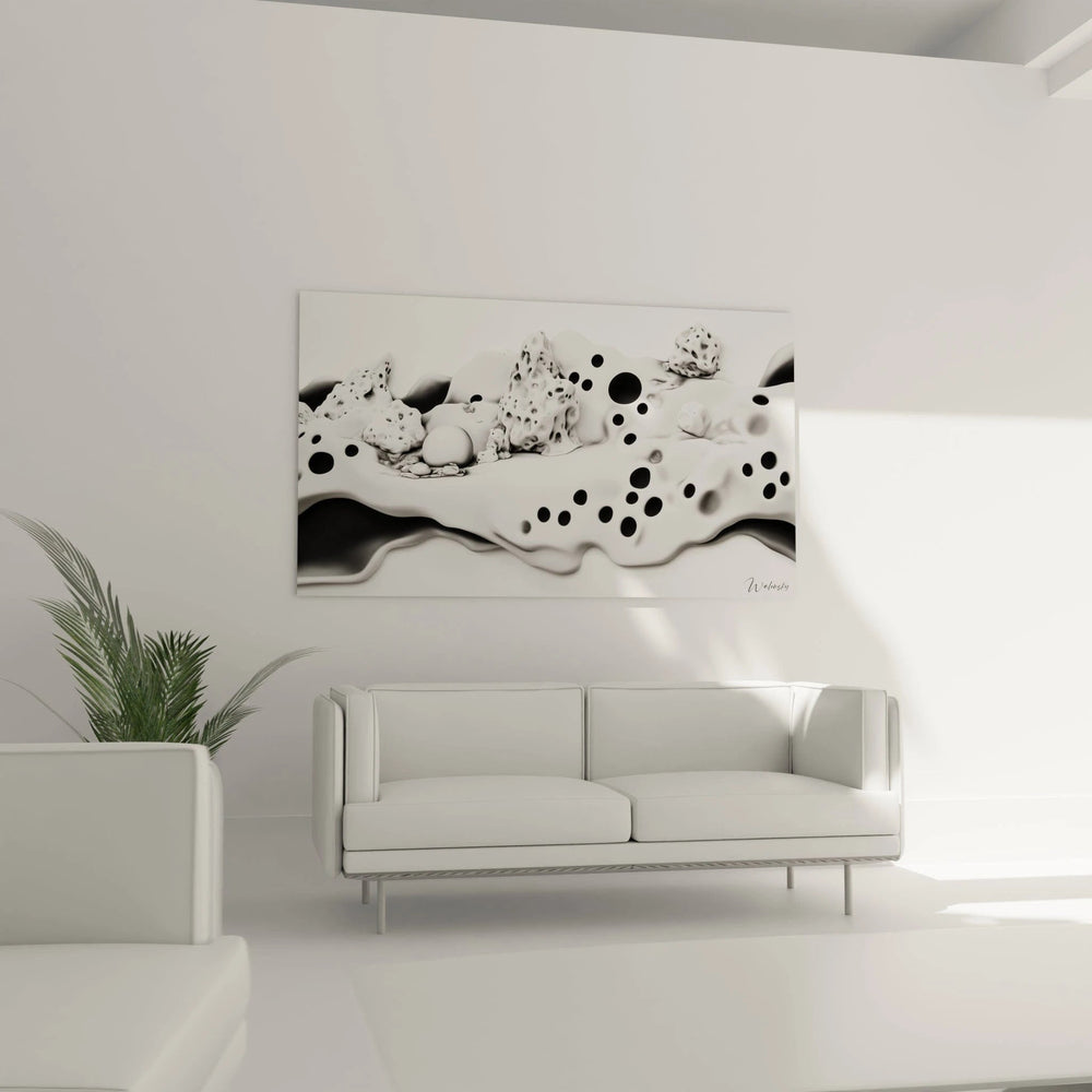 Ce tableau abstrait monochrome se distingue par sa composition organique où des formes fluides serpentent à travers un paysage de motifs ponctuels. L'œuvre présente une surface ondulante parsemée de points noirs de diverses tailles, créant un rythme visuel hypnotique sur fond blanc immaculé. Les tableau formes organiques noir blanc dominent la composition centrale, évoquant des formations rocheuses érodées ou des coulées de lave figées dans le temps. Cette décoration murale abstraite contemporaine capture immédiatement l'attention par son contraste saisissant et sa texture apparente. Les éléments distinctifs incluent des zones de densité variable où les points se concentrent ou se dispersent, créant un effet de profondeur remarquable.