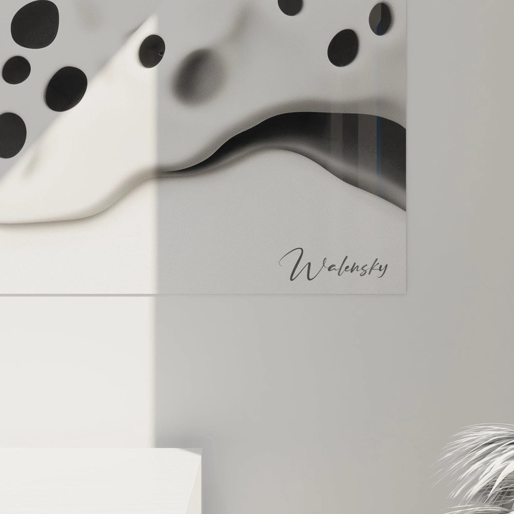 L'examen attentif de ce tableau abstrait points noirs révèle une richesse texturelle remarquable. Les surfaces ondulantes présentent un rendu lisse et fluide, suggérant une technique de coulée ou de modelage contrôlé. Les points noirs varient en taille et en opacité, certains apparaissant nets et définis, d'autres légèrement flous ou en dégradé. La technique employée semble combiner peinture acrylique et pochoirs pour les éléments ponctuels. Les effets de lumière créent des zones d'ombre subtiles qui accentuent le relief apparent des formes organiques. Cette décoration murale texturée moderne joue sur les contrastes entre surfaces lisses et zones granuleuses, générant une profondeur tactile qui invite au toucher virtuel.