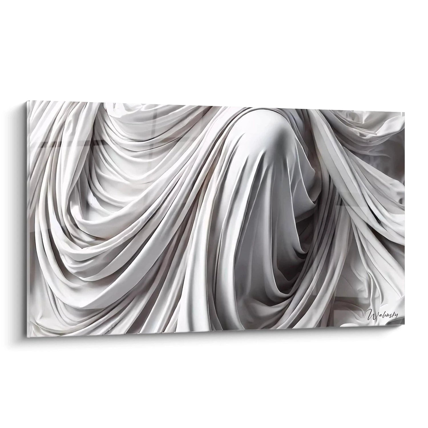Ce tableau vous transpose dans une atmosphère où le calme se fait palpable. Les nuances délicates de blanc, gris et argent caressent l’œil avec une grande subtilité, tandis que les ondulations du drapé évoquent une sensation de légèreté et de profondeur. Vous pouvez presque sentir la texture soyeuse du tissu sous vos doigts, entendre le murmure d’un vent léger qui anime ces plis figés dans le temps.