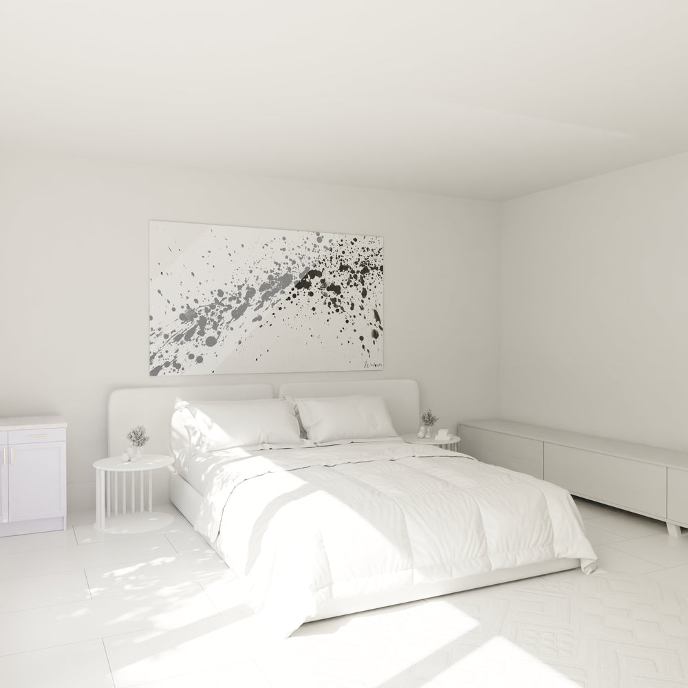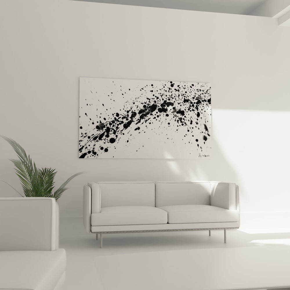 La palette chromatique se limite volontairement au duo fondamental noir et blanc, créant un impact visuel maximal par cette restriction assumée. Les noirs profonds varient en intensité selon la densité des projections, générant des nuances subtiles de gris par transparence. Cette art mural éclaboussures monochrome exploite brillamment les contrastes francs pour créer une dynamique visuelle puissante.