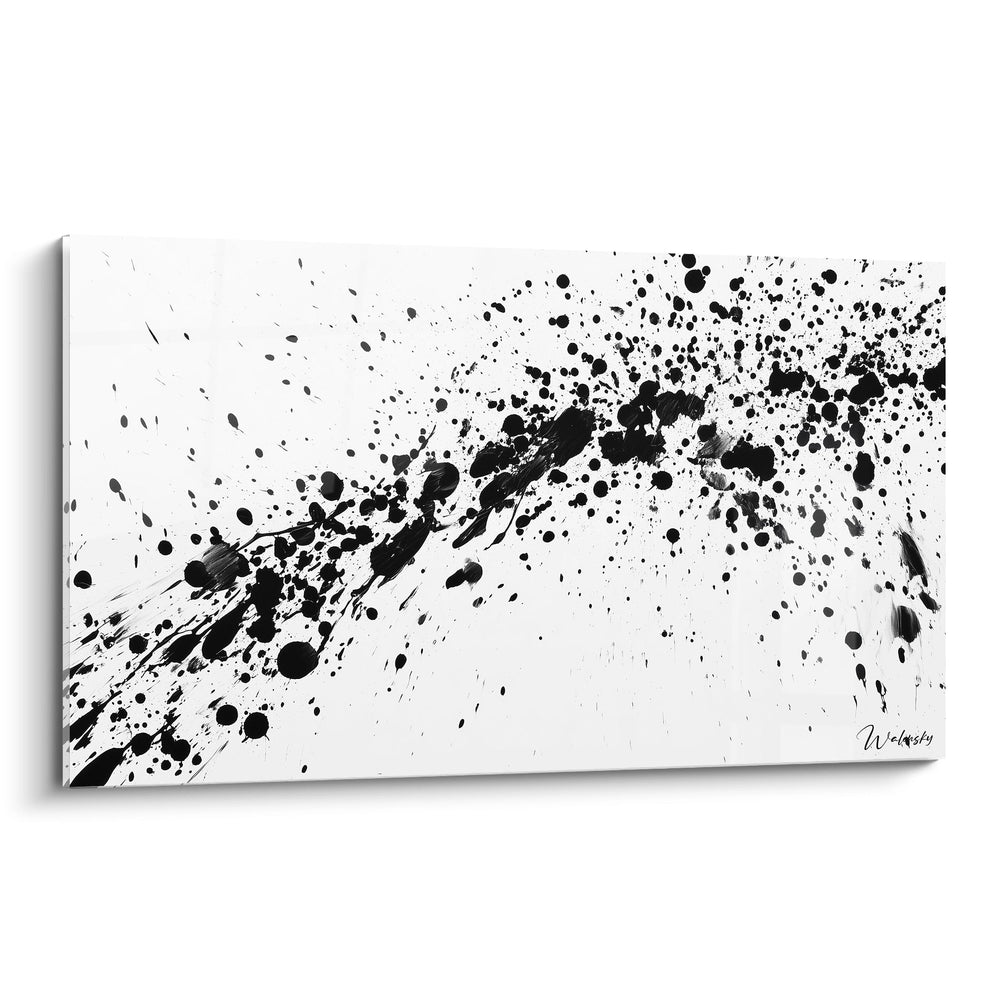 Ce tableau éclaboussures noir et blanc se distingue par son expression gestuelle spontanée et sa composition dynamique explosive. L'œuvre présente une répartition asymétrique de projections d'encre noire sur fond blanc immaculé, créant un contraste saisissant. Les éclaboussures abstraites contemporaines se concentrent principalement dans la partie droite de la composition, générant un mouvement visuel de gauche à droite. Cette décoration murale éclaboussures modernes capture immédiatement l'attention par son énergie brute et sa spontanéité assumée. L'absence totale de couleur renforce l'impact dramatique de cette création monochrome.