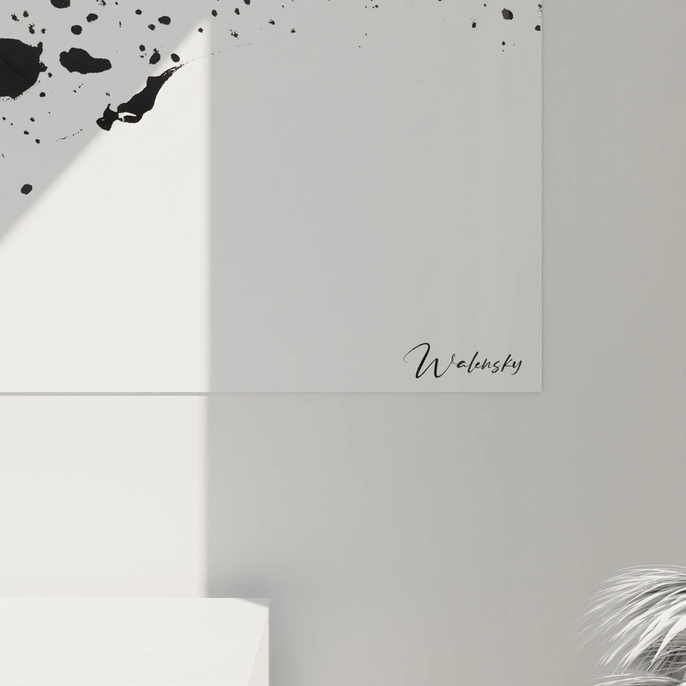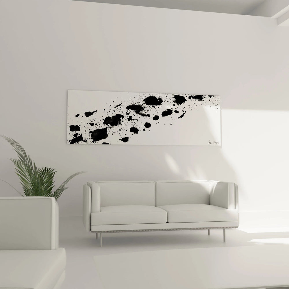 Ce tableau éclaboussures présente une composition abstraite saisissante qui capture l'essence du mouvement spontané et de l'expression libre. L'œuvre se distingue par ses projections dynamiques d'encre noire sur fond blanc immaculé, créant un contraste dramatique qui évoque à la fois la puissance créative et l'émotion brute. Chaque éclaboussure raconte une histoire unique, formant un ensemble cohérent qui transforme le chaos apparent en harmonie visuelle. Cette décoration murale éclaboussures contemporaine interpelle immédiatement par son caractère imprévisible et sa force expressive, révélant différents détails selon l'angle d'observation.