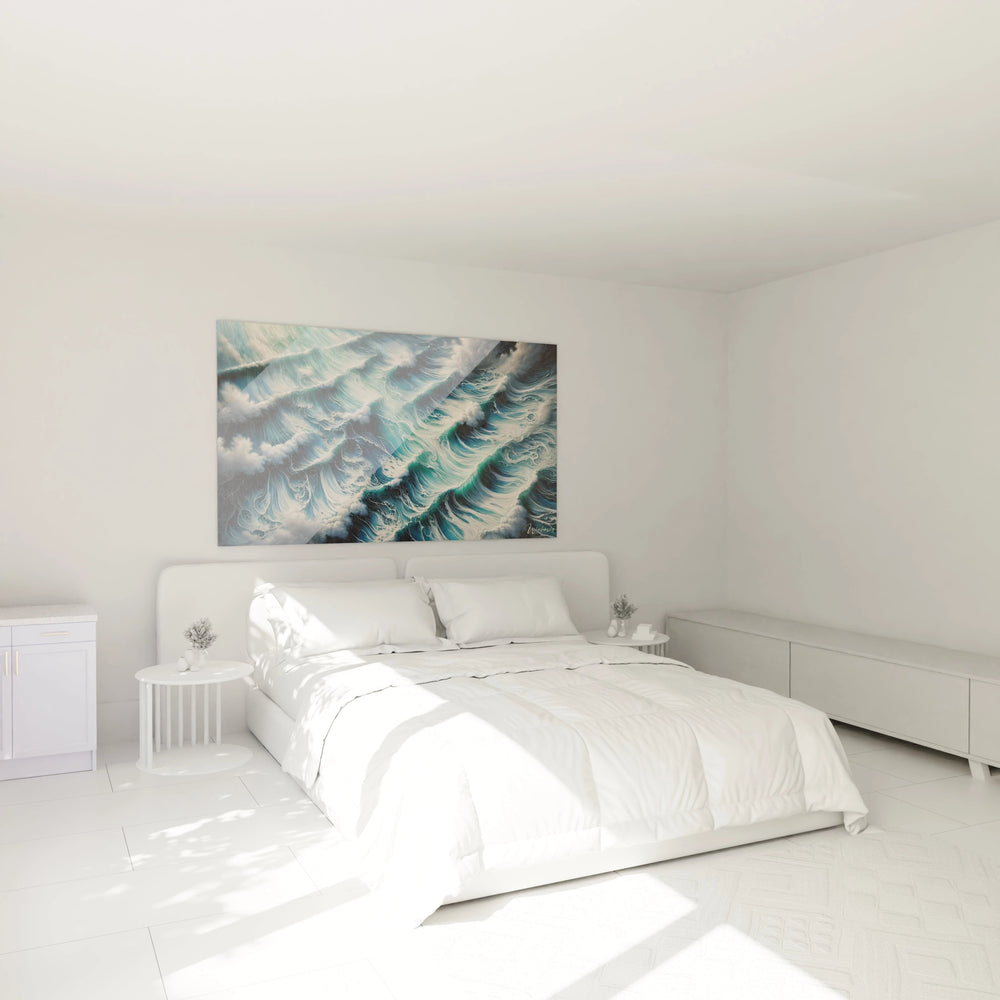Dans chaque trait fluide et chaque nuance délicatement choisie, ce tableau révèle le ballet hypnotique des vagues, miroitant entre bleu profond et vert émeraude, éclaboussés par des éclats de blanc éclatant. L’effet produit captive l’œil et l’esprit, comme si vous étiez au bord d’une falaise, sentant la brise marine caresser votre peau et le murmure constant des vagues rythmer vos pensées.