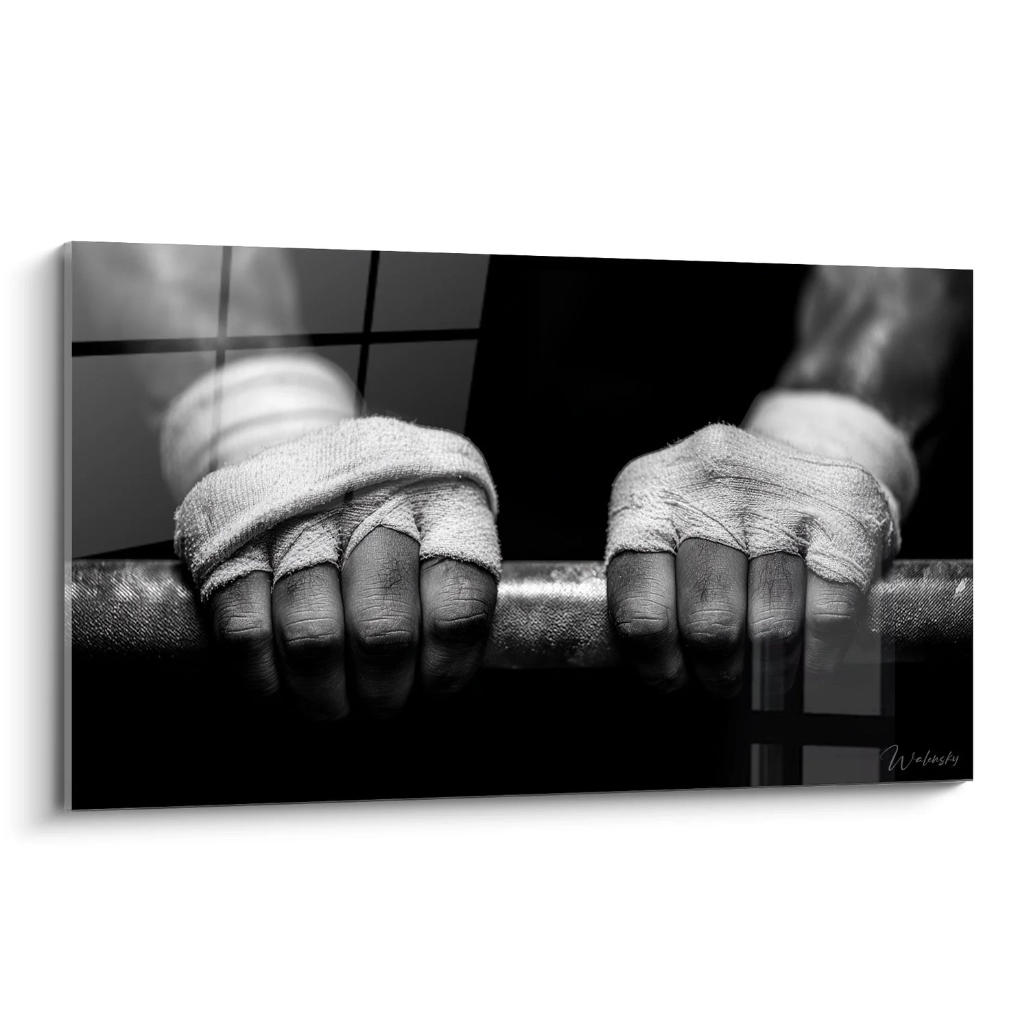 La palette monochrome de ce tableau sports noir et blanc amplifie la dimension symbolique de l'œuvre. Les nuances de gris créent un jeu subtil d'ombres et de lumières qui souligne la musculature et la tension des mains. Le noir profond évoque la détermination inébranlable, tandis que le blanc des bandages symbolise la pureté de l'engagement sportif. Cette art mural fitness utilise le contraste pour créer une dynamique visuelle puissante, où chaque détail raconte l'histoire de l'effort et de la persévérance humaine.