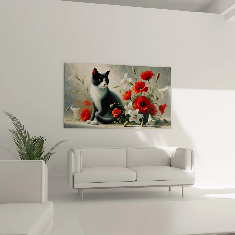 Ce tableau est bien plus qu’une simple décoration : c’est une invitation à la quiétude. Vous sentirez presque la douceur du pelage noir et blanc caresser vos sens tandis que le rouge passionné des coquelicots éclaire délicatement chaque recoin de la toile. Chaque détail est pensé pour évoquer un équilibre parfait entre la force et la douceur, le mouvement et le calme. L’œuvre dégage une atmosphère de paix profonde, idéal pour ceux qui souhaitent transformer leur intérieur en un sanctuaire de sérénité.