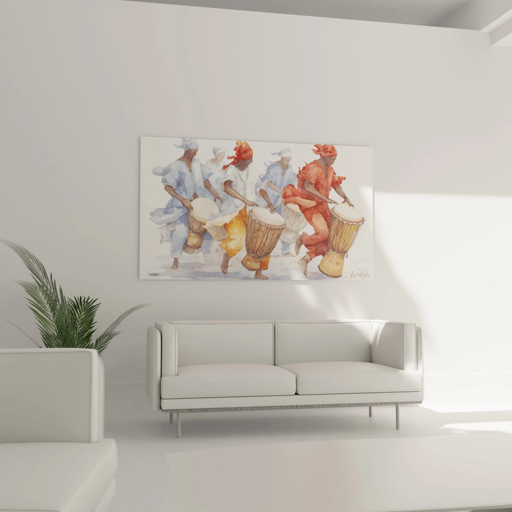 La technique aquarelle apporte une richesse texturelle exceptionnelle à cette représentation. Les tableau musiciens technique fluide révèle des empâtements subtils qui donnent du relief aux vêtements et aux instruments. Les zones d'ombre sont traitées avec des lavis transparents qui créent une profondeur naturelle. Les djembés présentent des détails minutieux dans les cordages et les surfaces en bois, avec des effets de matière particulièrement réussis. Les mains des musiciens sont rendues avec une précision anatomique remarquable, chaque doigt étant individualisé dans son geste musical. La fluidité de l'aquarelle permet aux couleurs de se mélanger organiquement, créant des transitions douces entre les différentes zones colorées. Cette décoration murale technique mixte allie maîtrise technique et expression artistique authentique.