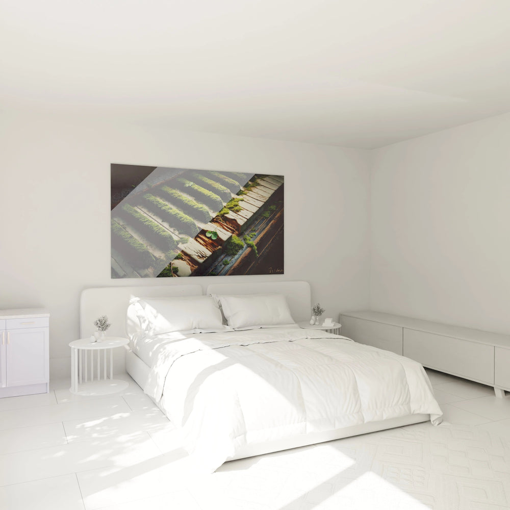 Ce tableau ne se contente pas de capturer un instant : il incarne une atmosphère, une poésie visuelle où chaque regard découvre des détails qui éveillent l’âme. La texture riche du bois ancien, contrastée par la douceur végétale, crée un équilibre saisissant qui apaise et invite à la réflexion. Dans votre intérieur, il agit comme un souffle tranquille, une pause magnifique qui transforme votre pièce en un lieu de calme et d’inspiration.