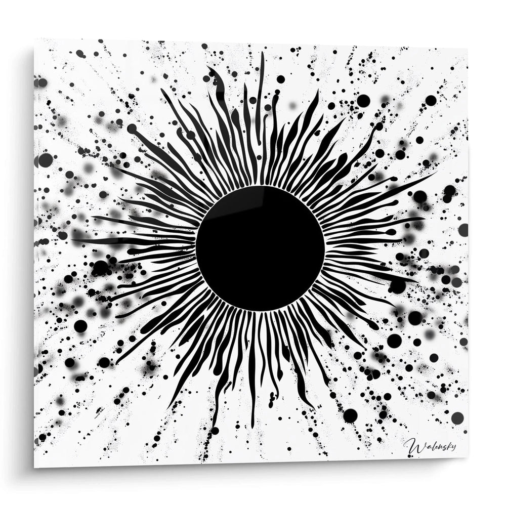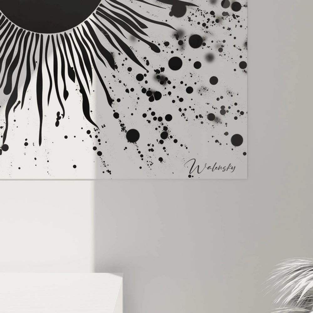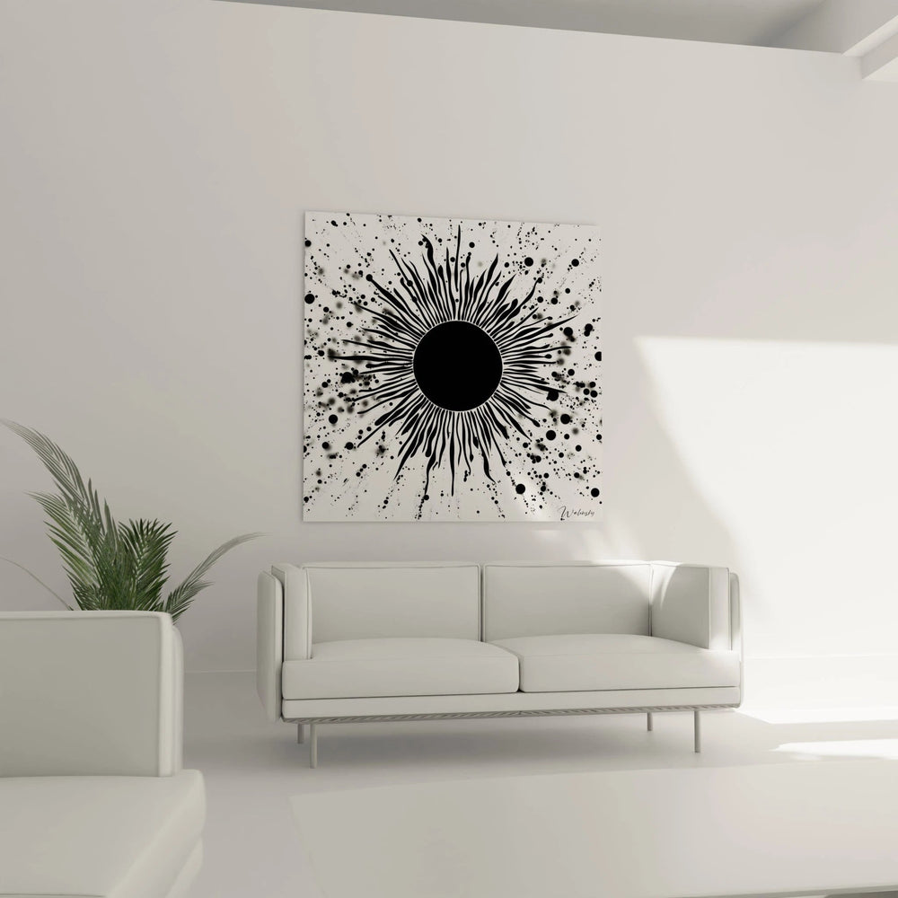 Vue de loin, cette œuvre s'impose comme une forme iconique puissante, le contraste saisissant entre le disque noir et les projections blanches créant un impact visuel immédiat qui évoque un phénomène céleste. En s'approchant, l'observateur découvre la richesse des détails qui composent ce tableau éclipse cosmique: les légères variations d'épaisseur dans les lignes rayonnantes, les subtiles gradations dans les éclaboussures d'encre, et la texture délicate du support qui transparaît par endroits. Ces détails microscopiques révèlent la complexité technique de l'exécution et transforment l'expérience visuelle, faisant de chaque distance d'observation une perspective nouvelle sur cette œuvre d'art mural abstrait captivante.