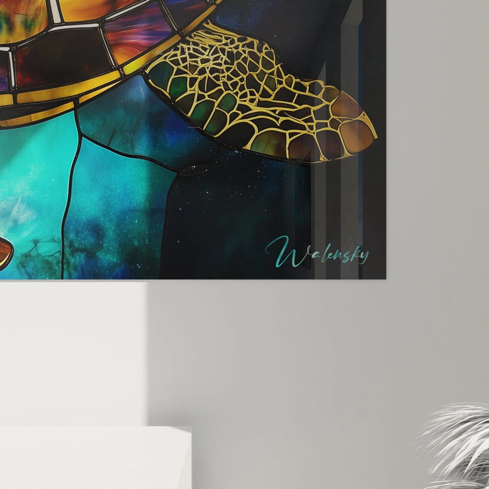 La silhouette dorée de la tortue contraste magnifiquement avec les fonds marins vibrants, créant un point focal immédiat qui guide le regard à travers la composition. Les délicates lignes noires qui encadrent chaque segment rappellent l'artisanat traditionnel du vitrail tout en définissant les contours anatomiques précis de cette créature marine iconique.