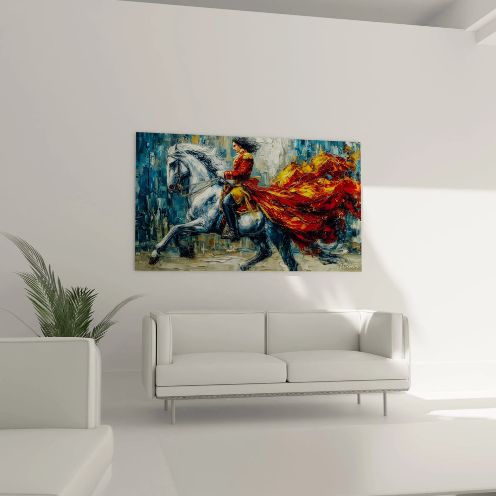Ce tableau Louis XIV à cheval présente le Roi-Soleil dans une scène dynamique et majestueuse. L'œuvre capture un moment de mouvement intense où le monarque français chevauche un destrier blanc aux crins flottants. La composition révèle un tableau Louis XIV cape rouge spectaculaire, avec des drapés écarlates qui s'envolent dramatiquement dans le vent. L'uniforme royal rouge orné de dorures témoigne du faste de Versailles, tandis que la posture droite et souveraine du cavalier évoque la grandeur monarchique. L'arrière-plan urbain suggère un contexte de parade royale ou de conquête, faisant de cette décoration murale Louis XIV une pièce d'exception.