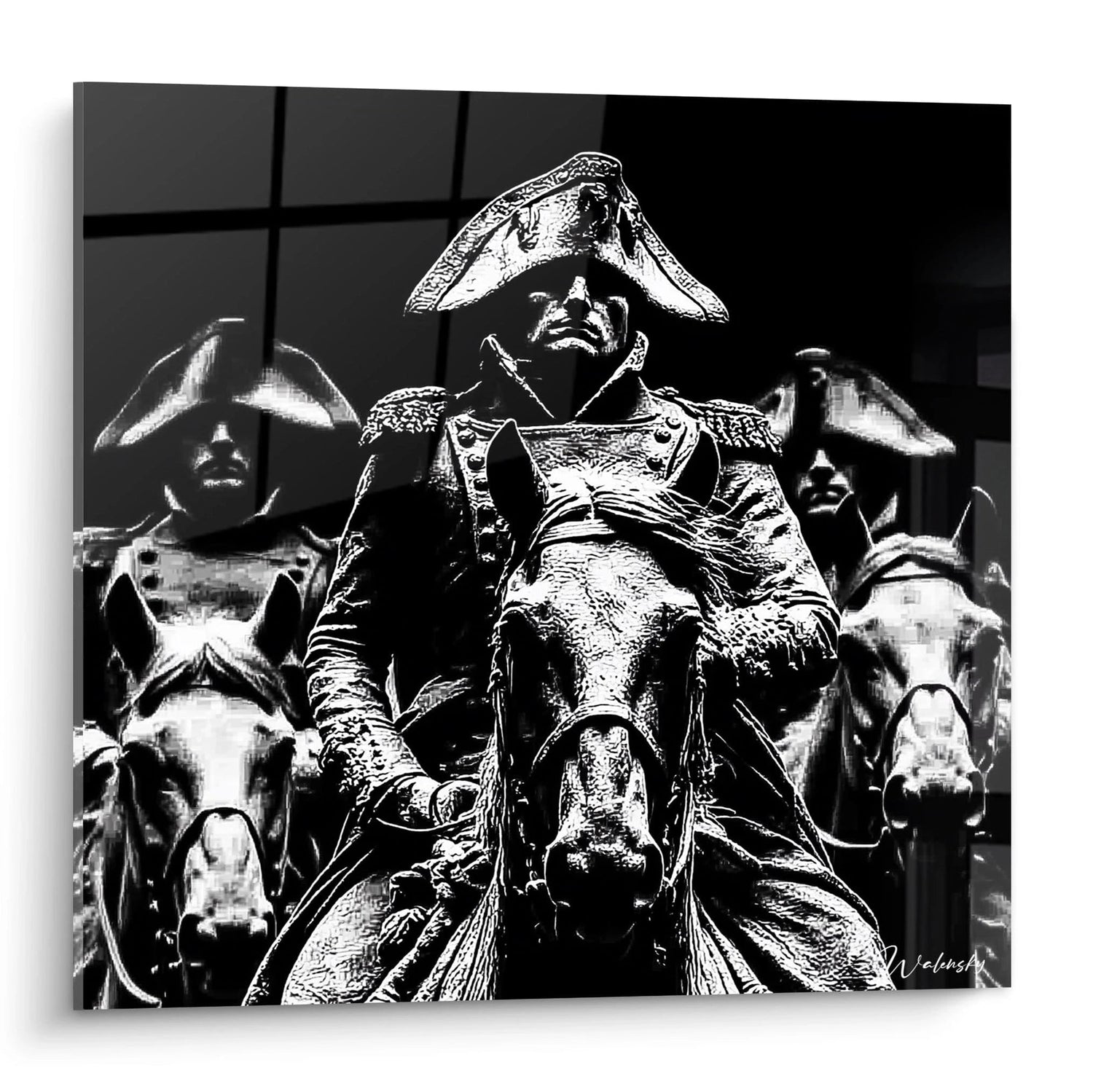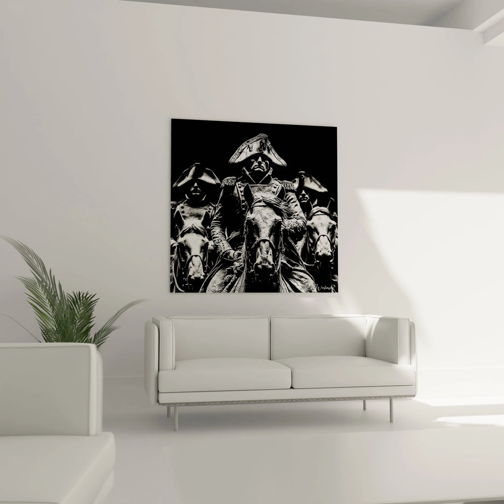 Ce tableau Napoléon présente l'empereur dans une représentation saisissante en noir et blanc, où les contrastes dramatiques créent une atmosphère particulièrement puissante. L'œuvre capture Bonaparte dans son uniforme militaire caractéristique, avec son célèbre bicorne, entouré de ses chevaux de guerre. Cette décoration murale Napoléon historique se distingue par son traitement graphique moderne qui transforme le portrait classique en une vision contemporaine frappante. Les détails minutieux de l'uniforme impérial, des décorations militaires aux épaulettes ornementées, sont rendus avec une précision remarquable qui confère à cette œuvre Napoléon une dimension véritablement exceptionnelle.