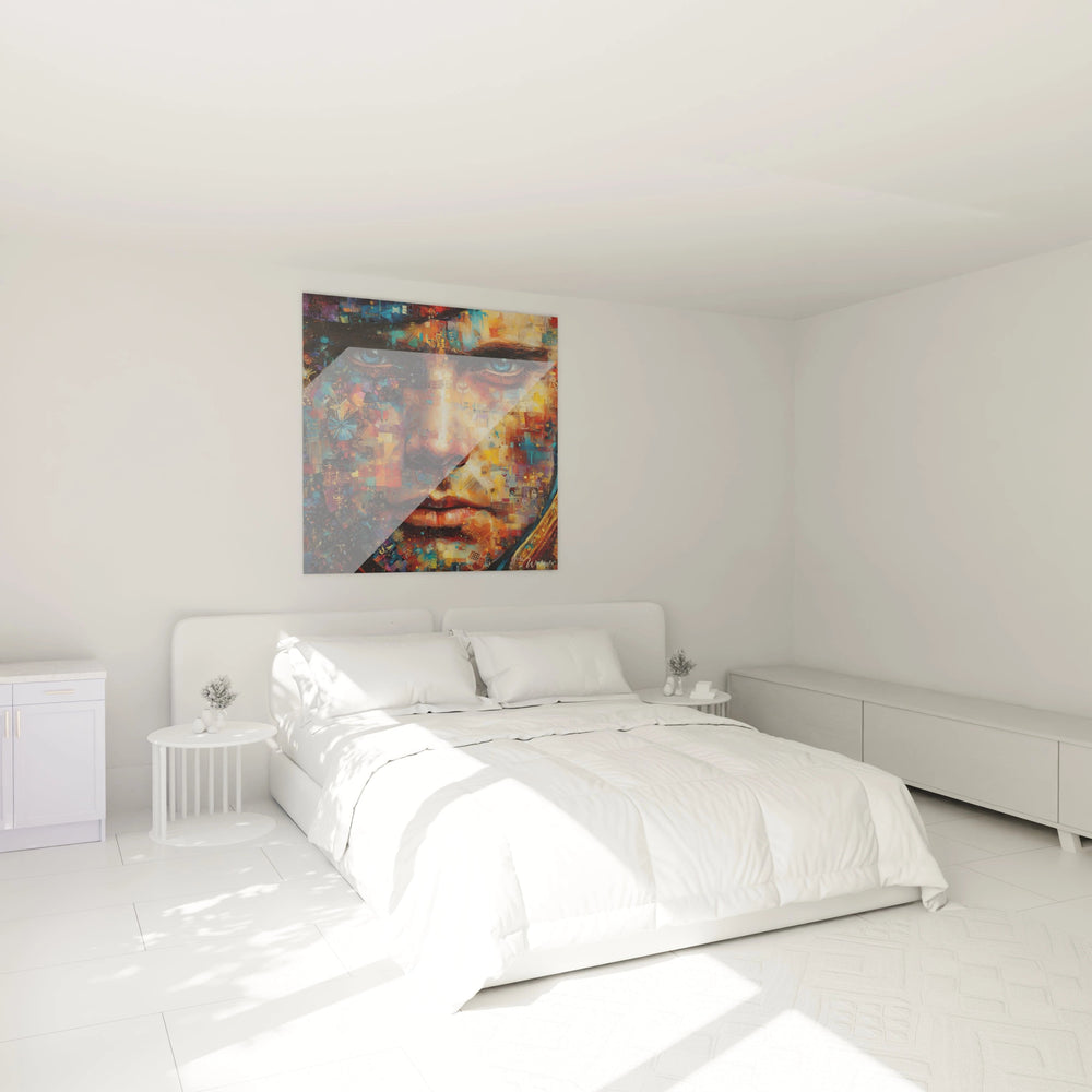 Cette art mural napoléon moderne se distingue par plusieurs caractéristiques impossibles à dupliquer. L'intégration parfaite entre réalisme historique et abstraction géométrique crée une signature visuelle unique. Les motifs géométriques qui composent les cheveux et l'arrière-plan semblent générés par un algorithme complexe, créant une infinité de détails. Le traitement particulier des yeux, d'un bleu cristallin presque hypnotique, contraste avec la fragmentation colorée du reste du visage impérial. Cette décoration murale napoléon contemporaine possède une qualité émotionnelle particulière : le regard semble suivre l'observateur, créant une connexion psychologique immédiate avec la figure historique. La technique mixte employée génère des effets visuels impossibles à reproduire mécaniquement.