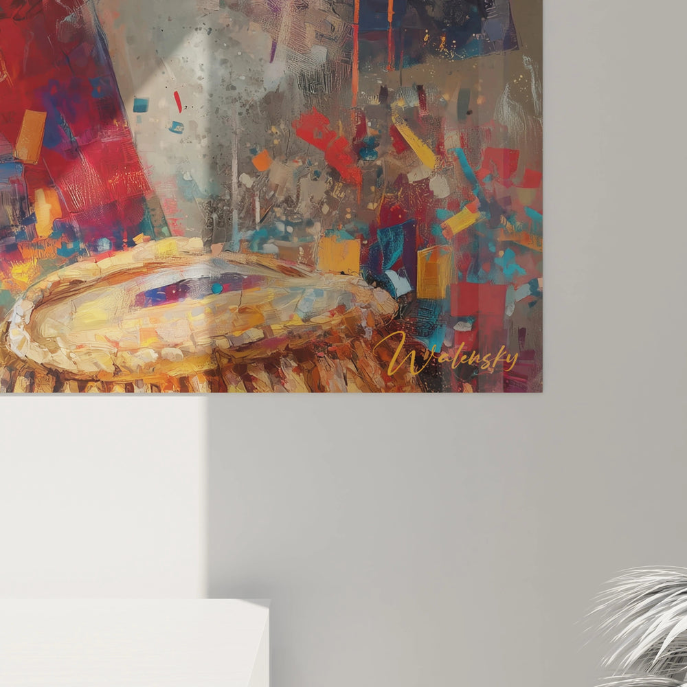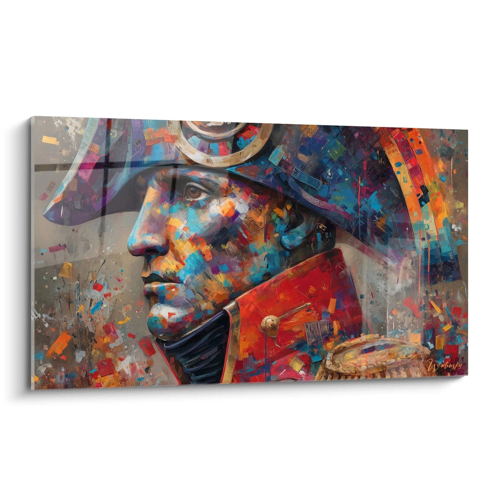 Cette décoration murale Napoléon colorée génère un impact émotionnel fort grâce aux contrastes chromatiques volontairement accentués. Les tonalités chaudes du rouge et de l'orange s'opposent harmonieusement aux zones froides bleues et violettes, créant une tension visuelle qui maintient l'attention du spectateur sur l'ensemble de la composition.