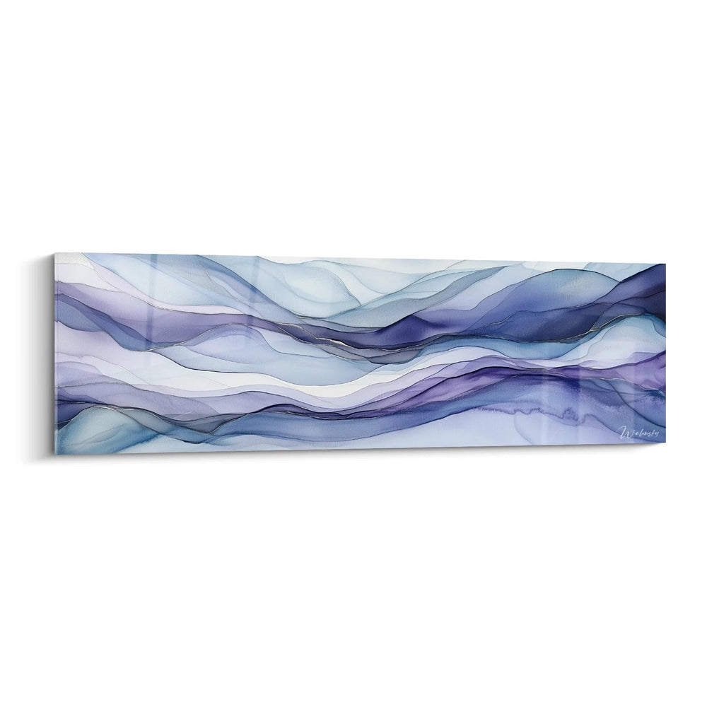 Cette décoration murale vagues contemporaines se distingue par sa composition horizontale élancée qui épouse naturellement l'architecture moderne. Les formes ondulantes traversent la toile dans un rythme cadencé, créant une profondeur visuelle remarquable. Chaque strate colorée possède sa propre transparence, permettant aux couches inférieures de transparaître subtilement. Ce tableau vagues bleues violettes révèle une technique sophistiquée où les pigments semblent danser entre eux. La fluidité des contours évoque les mouvements naturels de l'eau, tandis que la palette chromatique évoque les crépuscules océaniques. L'œuvre mesure approximativement un format panoramique, idéal pour les espaces de vie contemporains.