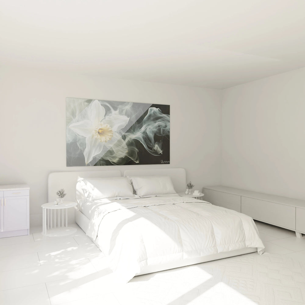 Conçu comme une ode à la poésie du végétal, ce tableau saisit le narcisse à l’aube de son éveil, où sa silhouette semble se dissoudre doucement dans l’air. La composition, subtilement équilibrée entre détails précis et textures aériennes, invite à laisser le regard dériver, à s’immerger dans cette ambiance presque onirique. Chaque reflet de lumière, chaque nuance de blanc et de gris vous transporte au cœur d’une nature intemporelle, empreinte de mystère et de douceur.