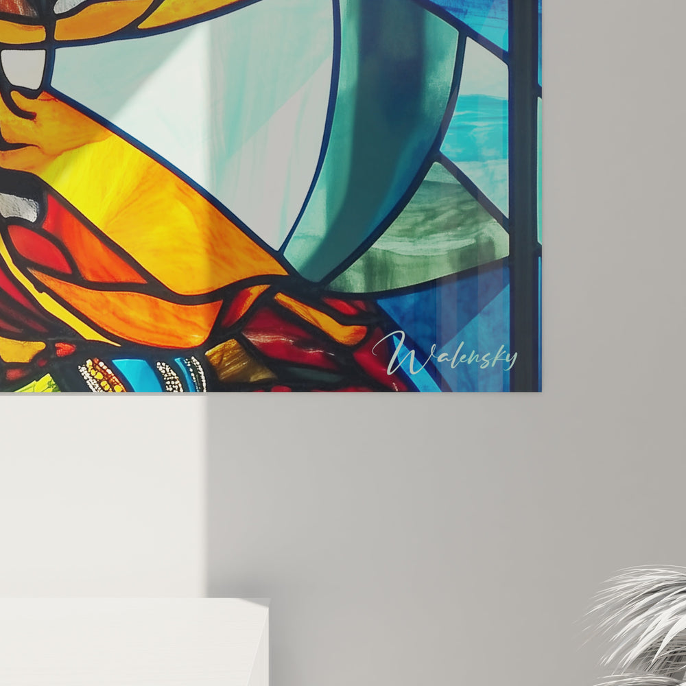 Le style du tableau mêle ingénieusement la rigueur géométrique des vitraux classiques à la fluidité envoûtante du mouvement divin. Les lignes épaisses noires qui épousent chaque segment rappellent le plomb des authentiques vitraux, encadrant des surfaces lumineuses où l’énergie cosmique semble prendre vie. Les détails précieux, tels que les bijoux et la coiffe, ajoutent une dimension luxueuse et raffinée à cette œuvre qui incarne le parfait équilibre entre force et sérénité.
