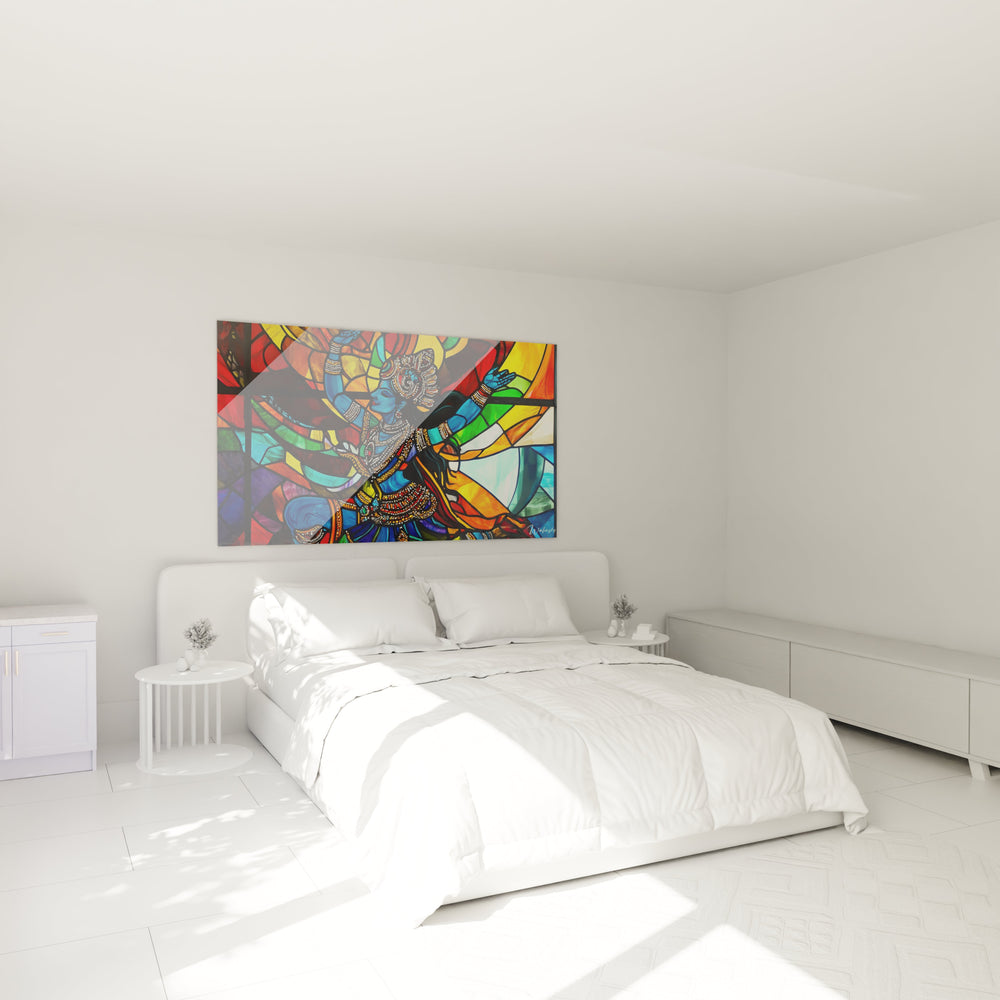 Né de la fusion entre l’art sacré hindou et l’esthétique des vitraux gothiques, ce tableau est une célébration de la danse cosmique. Il s’inspire des maîtres du XXe siècle qui cherchaient à capturer l’essence spirituelle par la couleur et la forme, rendant chaque regard une expérience unique et profonde.